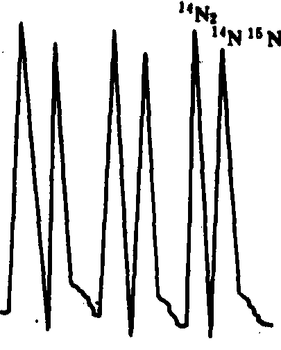 图1 质谱仪原理图 通过电磁分析器后,不同质量的离子分离,分别聚焦在不同的位置上,用离子接收器接收离子流。根据电流计上读出的离子流的强度,就可知道不同质量离子的比值。一般电磁分离器的曲率半径是一定的,而且只有一个接收器,但可以通过改变电场电压或磁场使不同质量的离子轮流聚焦在同一接收器上。前者称为电扫描,后者称为磁扫描。同位素质谱仪主要由进样系统、离子源、质量分析器、接收系统和记录系统组成。 光谱分析 其原理是基于N2分子发射光谱的同位素迁移效应。即N2分子受到外来能源的激发后,同位素组成不同的分子发射光的波长产生位移。当分子受到激发时,其轨道电子跃迁到较高的能级,这个分子就处于激发状态。当电子从高能态回到基态时,能量以光子形式发射出来,即产生发射光谱。激发分子的能量由电子跃迁能。分子振动能和分子转动能组成。一种元素的各种同位素的电子状态是一样的,而核质量不同,分子振动能量和原子质量有关。由于振动能的差异,引起光谱带波长的位移。三种氮气分子,28N229N2和30N2在2~0带光谱带的波长分别为297.7纳米,298.3纳米和298.9纳米,位移0.6纳米,且有较大的光强,带光谱的强度与对应的分子数成正比,因而由适当的分光器分离后,由光电倍增管接收变成电信号,经放大,整流后,变成电压的变化,以谱峰的形式记录下来,根据谱带头的高度计算15N丰度。 光谱仪主要由发光、分光和记录三部分组成。❶发光部分。在高真空状态下将N2封入放由石英或能透过紫外线的特制玻璃制作的放电管中。有的放电管是开放式的,如NOI-6型光谱仪,N2样品由氦气流导入开放的石英管中,测量完后为继续流入的氦气流清除。高频发生器或微波发生器供给N2分子能量,使其激发。 ❷分光部分。其功能是将混合光分离成单色光,一般为棱镜和光栅。 ❸接收器和记录系统。光电倍增管接收一定波长范围的单色光,将光的信号按比例地转换成电信号。光电倍增管阴极接收信号,在阳极产生电压变化,带动记录仪的笔移动,描绘出谱带头的高度。