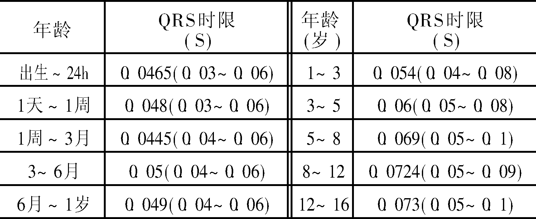 又称“QRS时限”。是QRS波群起点至终止的时间,代表全部心室肌除极的时间,在正常成人肢体导联为0.06~0.10s,胸导联为0.06~0.11s,多数在0.08s左右。各年龄组儿童QRS波时限见表。