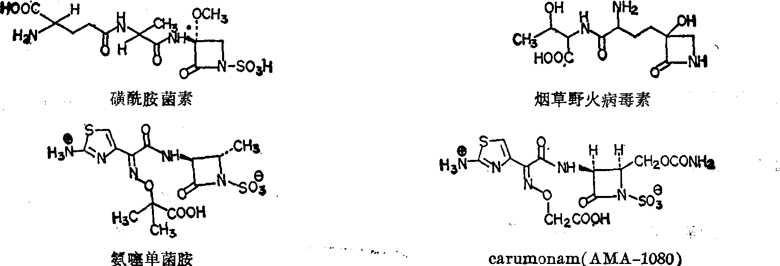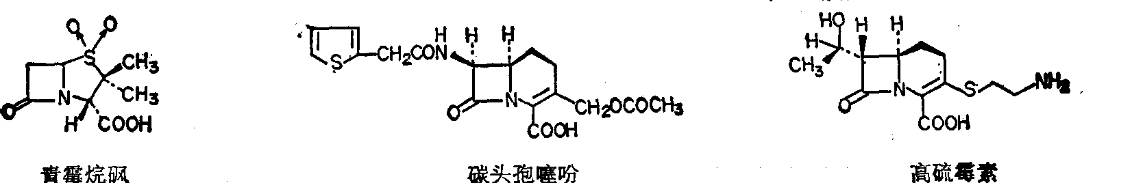 β 内酰胺类抗生素的分类: 按化学结构分类,见表2,各类型β内酰胺抗生素的主核与代表性药物的化学结构见图1~4与表3~7。 β内酰胺类抗生素的产生菌: 分布很广。可由真核微生物、放线菌及细菌产生。 (1) 由真核微生物产生:自1929年Fleming发现青霉菌抑制葡萄球菌生长现象起直到1971年发现若干放线菌可产生头霉素以前,所有报道的β 内酰胺类抗生物质都是由真核微生物产生的。多种真菌能产生带有疏水性N-酰基侧链的青霉烷,但不能产生带有同样侧链的头孢烯。头孢烯类产生菌分布甚广,产物的侧链都带有亲水性的D-α-氨基己二酸,且同时产生青霉素N,迄今尚未发现酵母菌产生β内酰胺。 (2)由放线菌产生: 1971年Nagarajan等从放线菌得到头霉素以后,至今已知放线菌产生一种青霉烷、10种以上头霉烯、6种氧青霉烷、30余种碳青霉烯与近10种吖丁啶-α-酮,是天然β 内酰胺抗生素的主要来源。 (3) 由细菌产生:1981年今田等从假单胞菌(Pseu-domonas)的代谢产物中发现磺酰单胺菌素,随后Sykes从多种革兰阴性细菌中得到这类抗生素,近来又发现黄杆菌(Flavobacterium),黄单胞菌(Xanthomonas) 产生去乙酰氧基头孢菌素C,从沙雷菌(Serratia)与欧文菌(Erwinia)中发现2,6未取代的碳青霉烯SQ-27860。 β内酰胺类抗生素的生物合成: 这类抗生素特别是青霉素与头孢菌素的生源与生物合成都有较深入的研究。(见“青霉素类抗生素”条)。 β内酰胺类抗生素的全合成: 重要的β内酰胺如青霉素,头孢菌素,棒酸、硫霉素、诺卡霉素、磺酰单胺菌素等都已前后完成了全合成。关于β内酰胺环的形成、已发现4个类型60余种环化反应。 β内酰胺类抗生素的结构改造,已取得显著成绩,据统计已合成5万种以上的半合成青霉素与约25,000种半合成头孢菌素,具有特点并已临床应用的有60种以上。6-氨基青霉烷酸(6-APA)、7-氨基头孢烷酸 (7-ACA)、3-氨基诺卡霉素(3-ANA)、与3-氨基单环酰(3-AMA)是半合成β 内酰胺的重要原料。