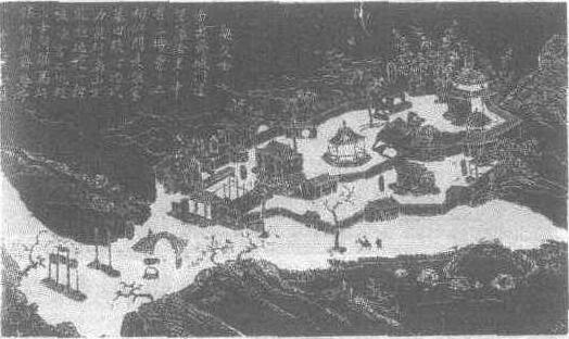 清康熙。长63.5厘米,宽112.5厘米。河南南阳武侯祠藏。此图详尽地刻绘了康熙年间重修卧龙冈(位于河南省南阳市西)的全景。画面起自“千古人龙石坊门”,向后分别有“真神人也”牌柱,“诸葛井”、“仙人桥”及“武侯祠”。“武侯祠”内“出师表”碑廊、“道院门”、“茅庐亭”、“野芸轩”、“三顾堂”、“古柏亭”、“谢凤亭”、“抱膝亭”、“老龙洞”、“伴月台”、“躬耕亭”、“晴风楼”、“紫峰”等名胜古迹错落有致地分布其间。图的右上角,刻有楷书“梁父吟”一首。全图以乱云飞渡,大雪纷纷,山峦清冷,松竹瑟瑟的冬景为陪衬,将卧龙冈刻画得苍古、寥落。皓皓白雪与雄浑的建筑、峰峦、彤云的鲜明对照,产生了黑白有致的镶嵌工艺的效果,别具韵味。卧龙冈相传为三国蜀汉丞相诸葛亮的躬耕之地。唐宋时,建立了武侯祠。现设有南阳历史博物馆及汉代画像石陈列馆。