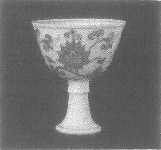 明。高8.8厘米,口径7.5厘米。北京故宫博物院藏。成化斗彩开创的釉下青花和釉上多种彩色相结合的新工艺,取得了空前的成就。其超薄的瓷胎,洁白的底釉,鲜艳的色彩均已达到无以伦比的程度。万历《野获编》云:“成窑酒杯,每对至博银百金。”此高足杯杯口外撇,深腹,喇叭形高足,并有一圈突起。杯外壁饰四朵缠枝莲,以绿、黄、红、青花等色填彩。花色浓艳,五彩纷呈,为小巧玲珑的器形增添了无尽的风采。有青花楷书“大明成化年制”款,是一件极为珍贵的成化窑斗彩器。斗彩见“斗彩高士图瓷杯”条目。