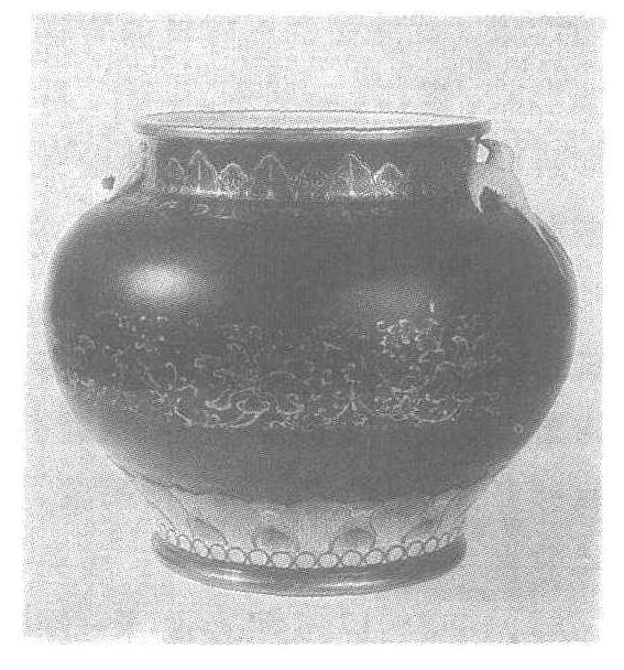 清。高31.3厘米,口径25.1厘米。北京中国历史博物馆藏。此尊圆唇、直颈、鼓腹、矮圈足,通体霁青釉,莹亮如镜。其上有金彩描绘的蕉叶纹,如意纹和缠枝莲,近底处有凸雕的莲瓣,莲实和连珠纹,并以粉彩装饰。颈肩部位对称贴塑着施白釉海燕,形象极为生动。霁青象征河清,海燕与海宴同音,此尊以“海宴河清”寓意天下太平。底有篆书款“大清乾隆年制”。据传此尊原存圆明园海宴堂。