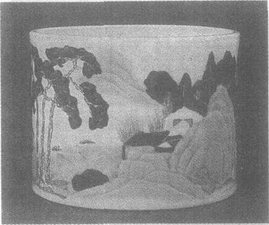 清。高14厘米,口径18.5厘米。台北故宫博物院藏。釉里三彩见于清代康熙时期,在瓷胎上以青料、红料和豆青料三色绘成图案,再吹上白釉,然后入窑焙烧。豆青地的则以青、红、白三色描绘花纹,纹饰轮廓多数以刀刻成。此笔筒直口、深壁、底微凹。器身白釉为地,以青花、釉里红和豆青绘制山水。画工以豪放、酣畅的笔触描绘出一幅冬季山岭,河流的景致。皑皑白雪覆盖着重山峻岭,松柏苍翠,河水淙淙,既有肃杀的寒意,又蕴藏着春之将至的勃勃生机。有些树木还以釉里红施彩,更给人一种新生的活力。此笔筒在施彩前先刻画了轮廓,故景物呈现立体感。器底有青花“大清康熙年制”行楷款。