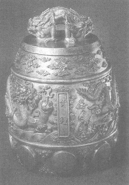 清。高21.2厘米,纽高6厘米,厚1.2至2.1厘米,上径13.6厘米,中径20.6厘米,下径16.2厘米。重24500克。北京故宫博物院藏。此钟为金编钟之首——黄钟。外形椭圆,顶和口部皆平,双龙纽。钟身錾刻云龙纹,一面竖錾“康熙五十四年制”字样;一面竖錾“黄钟”二字。黄钟的音调属于现代E调的“1”。金编钟亦称金钟,用纯金制成,是皇帝举行大典时使用的乐器之一。全套编钟共有16枚,与铜编钟不同之处是没有大小之分,只是钟壁有厚有薄,因此敲击时也能发出不同的音阶。全套金编钟总重为460818克。