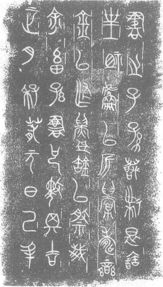 春秋晚期(晋国)。北京中国历史博物馆藏。《栾书缶》是栾书祭祀祖先时盛酒的用具。器身及盖各有四环纽,纽作斜角云纹,自颈、肩及于上腹有错金铭文五行40字,盖内铸铭文两行8字,大篆体。错金镶嵌铭文始于春秋中期,多见于兵器,铭文往往数字,像《栾书缶》这样长篇错金铭文,十分罕见。春秋晚期的晋国正体篆书逐渐被简易的写法取代,“草篆”开始流行,具有地区性特征的文字和书法正以全新姿态出现于历史舞台,《栾书缶》铭文即为这种形势下的产物。它十分精美,文字异体较多,字呈纵势,草篆结构奇诡而神秘,章体雍容华贵,线条圆润婉转,显得婀娜多姿。