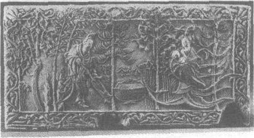 南朝。高19厘米,宽38厘米,厚6厘米。1958年河南省邓县学庄墓出土。河南省博物馆藏。此人物故事画是历代被儒家大肆宣扬的所谓“二十四孝”故事之一。据《太平御览》引汉代刘向《孝子图》所记,“郭巨埋儿”的情节大意是说河内温地人(今河南温县)郭巨,家中存有两千万钱,待其父死后,他的两个弟弟各取走一千万,郭巨不但分文没得,还得赡养母亲。正当此时,他的妻子生了个小孩。郭巨恐怕日后因得子而妨碍养母,决定埋葬他的孩子。当他掘地挖坑时,得到天赐的一釜黄金,他的孩子得救了,他也因此名扬天下。此砖所绘内容即郭巨夫妻在树林中埋儿得金的情景。画面左端的郭巨,正弯腰蹬锹掘地,右端其妻双手托子立于树下,面色惊讶地望着他。二人间为一装满金饼的圆釜。人、物旁分别印有反书的“郭巨”、“妻子”和“金壹釜”榜题。在河南登封县东汉延光二年(公元123年)建造的启母阙上,也刻有此故事画像,由此可见历代统治者对孝道的重视和提倡程度。