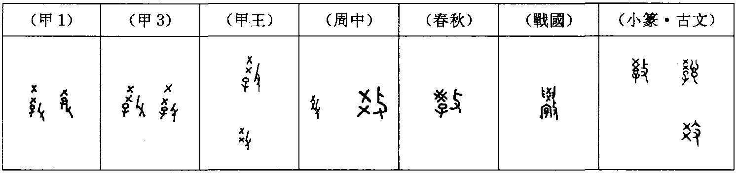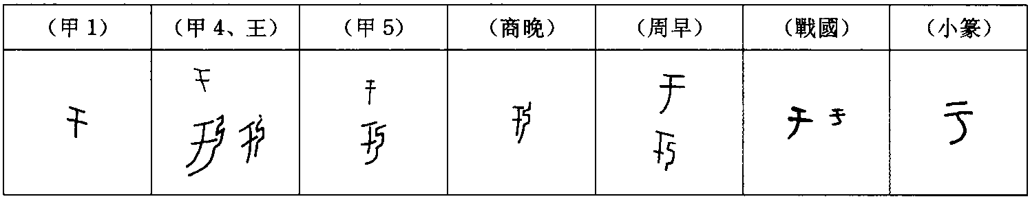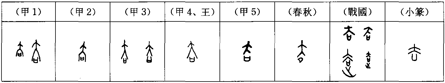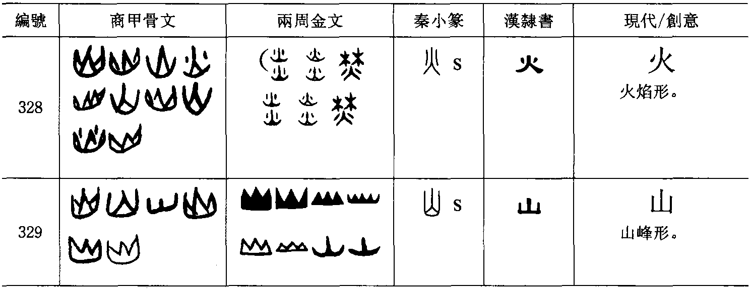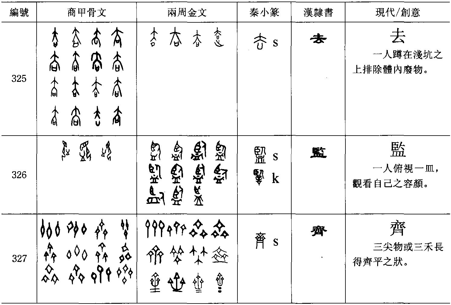 再如監字(字326) 【 , 臨下也。 从臥, 䘓省聲。 , 古文監从言】作一人俯視一皿以觀看反映之自己容顏,後來以之稱呼照顏的銅鏡,又加上金的形符。此字的創意既明,則皿中有物的應是較合理的形構,沒有一點的應是省略的結果。甲骨文作沒有一點,很可能因為字形太小的緣故。眼睛與身軀分開的自是後來的訛變。身子移到皿之上的,也應是後來才有的結構調整措施。有時兩個字形的筆劃差不多,時代也相近,從創意的角度也可以提供參考。 如貧字【 , 財分少也。 从貝分, 分亦聲。 , 古文从宀分】以分貝表意。所附的从宀从分的古文字形,也是象意字。古文字形以分家而貧困的表意,可能比較不明顯,也容易被誤以為是形聲字,故而換以分貝。宀的符號以表現建築物為主,而貝才是有關財產的常見符號,比較容易被人所了解,故應是較晚的字形。類似的創意有寡字(字220), 作屋中有一大人物之狀 ( ), 表達貴族人數較一般民衆量少。大概也因創意不清楚,戰國簡書所加人身前後無意義的填空小點可能被誤識為分字 ( ), 以致看起來有表達分家而致家產減少之創意。攸字(字306)甲骨文作手持杖撲打一人之狀,到了西周中期演變成兩形: 一是人之背後增一直線 ( ), 一是增三下垂小點( )。 《說文》的意義“行水也”, 應是打得背部血流下行的引申義,可推論三小點是具有輔助說明的作用,一直線應是不明創意的訛變, 是較遲的字形。 至於 《說文》所附的秦刻石字形 ( )从水从攴,表達以棒擊水,難符創意。水的構件可能是由人與三小點的字形訛變而不是全形省略了人的部分,時代應更晚。又如疊成三角形是常見的排列形式,雖然有的字在甲骨文已是如此,但從創意的觀點看,知應是較遲的寫法。 如齊(字327) 【 , 禾麥吐穗上平也。 象形。 凡齊之屬皆从齊】,甲骨文大都作三尖狀物排列成三角形之形勢。尖狀物是否為禾穗是值得討論的,鑒於古代情況,它很可能表現銅鏃。為了穩定箭的飛行,箭桿與銅鏃都要求製成一定的規格,鑄造時才可控制鑄成同樣的大小和重量。它既然表達齊平、齊同的意義,則三物應處在同一平面上,因此可假設甲骨文之做三尖物齊平之字形者較原始。魯司徒仲齊盤上的齊字作三物齊平狀,可能反映非常早的字形。從文字演變的常律看,多件平列的都演變成上一下二的三角形,齊字也應是其中的一例。(四)演變的常律 字形的演變,類似的筆劃常習慣性地按同一模式進行,也可用來判斷有同樣變化的字的演變方向。如帝字(字72)可能作花朵形,或捆紮之崇拜物形 ( ), 後來在最上的橫劃上增多一短劃 ( ), 這樣的例子甚多,如正(字35)、天(字98)、言(字233)、平(字310)、王(字312)、辰、商(字336)、競(字337)、不、雨、辛、可等,就可據以判定演變的方向。它的可靠性可能要高過文獻年代或性質的條件。文字的使用或演變,除上述的復古外,或由於區域性的演變進度有差異,或甚至出於某特殊的情況,如小篆的有意整理戰國文字,有意或無意地恢復了早先的字形,以致年代較晚的字形保持了較早形式。如此,字形演變的常律就成了判定字形演變方向的重要條件。譬如平字(字310)金文作稱重物的天平形象 ( ), 春秋晚期或戰國時代時, 循自然演化的常態, 在平劃之上加一短橫 ( ), 但小篆則去掉短橫( )。 同樣的, 天字(字98)甲骨文作一人特著其頭部形 ( )。 圓頭因刀刻而成方形 ( ), 簡易成兩短劃 ( ), 再省去一劃 ( )。至春秋晚期, 平頭之上加一短橫 ( ), 小篆去掉短橫 ( )。 下字(字52)甲骨文作一長劃之下一短劃 ( ), 西周時下增一直豎 ( ),戰國時也在平頭之上加一短橫 ( ), 小篆則去掉短橫 ( )。 這幾個字,雖然一般認為小篆的時代較戰國時代為晚,但可以根據演化的規律,知沒有短橫的應是較早的字形。它不但有助字形演變方向的確定,有時更早的字形或資料雖還未出土,就可以根據字形演變的規律,推測其較早的字形。文字初創時,每一點一劃都表達具體的意義,故如有一點一劃不能給予合理的解釋,則創意的解釋就有問題。有時就可以依演變的規律,復原正確的字形,不必理會訛變或沒有意義的填空部分。譬如商、周、興(字149)、高(字73)、裔等字,□的構件是常見的無意義的填充,談到創意時,就可以不理會它。如果想強加說解,可能就會被誤導。譬如興字, 甲骨文絕大多數作四手共舉一輿架之狀 ( ), 第三期有時作肩輿之下的空間多一口 ( )。從演變常律, 知口的部分是無意義的填充,其創意的重點應在升高的動作。如果因為包含有口的構件,就轉移了創意的重點,強調其為舉重物時的喊叫聲,並聯想及詩歌的賦比興,如此不但不得創意的重點,連字形演變的方向也顛倒了。但尋字(字296), 第五期有多一□的字形 ( ), 它不在填空的位置, 就可視為別義的意符,而不是無意義的了。如果變化不合某種常規,也對一個字是否可能有某種變化的判定有所助益。譬如攻字(字120),甲骨文第一期作手持棒槌一類的曲柄殳敲打一件下有三小點的工形物 ( )。 作為填空的無意義增繁小點, 通常是對稱的。工形物下的三小點是不規律、不對稱的,因此沒有三點的攻字可能是由有三點的攻字簡省演變來的。這樣就不能輕易地把它當作形聲字看待,而要把它歸屬到表意的字形,即是說,不能不對三小點作創意的合理解釋。由於曲柄殳在甲骨文常代表樂槌,而商代也出土長條形石磬。石磬的調音工作,以刮削石磬的表面