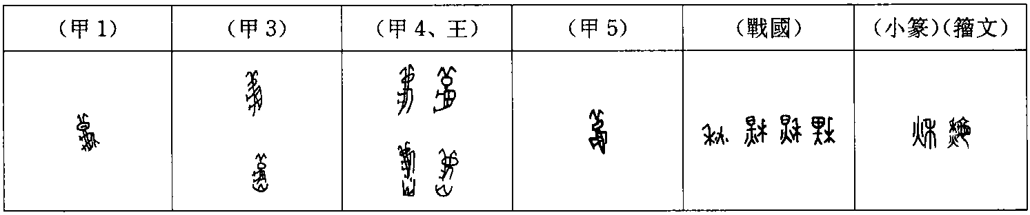 蛛字(字201)的形聲字形作从黽朱聲 ( ), 小篆或从虫 ( )。虫的筆劃也比黽少得多。 又如鑪(字204), 本是象形字 ( ), 先是加上虎的聲符 ( ), 後來因為鍊金而構築, 故从金 ( )。 有的因它是生火的器物,也不一定用來鍊金,就从火。古代大部分的爐子以陶土構造,故有从缶的罏。從目前的資料看,可能站立式的燒火爐流行較晚,早期鑪子多以煉金為目的,所以從金的鑪字出現最早。小篆收有籀文罏字 ( ), 但無爐字。 爐字見於漢代的銅爐, 現在也以爐字最常見, 其代換的構件,呈現時代越晚筆劃越少的現象。但有時是因著重點不同而使用不同意符,或為了別異而選用另一個筆劃較繁的聲符,因非基於有意的簡省, 就難據以判定演變的方向。 如賢(字335) 【 , 多財也。 从貝,臤聲】本為从貝的形聲字,表達多財之人,也引申為多才、盛德的人,故別造从子臤聲之字以別義。它雖筆劃少,義類也較合理,但不被接受,最後還是選擇賢字。書寫過程中偶發的錯誤,有時也被舉以為字形演變的例子。甲骨由於順應刀法的便利,有先刻直線再刻橫劃的習慣,以致刻完直劃後忘了刻橫劃。這就不應該視為簡省,除非同樣現象的例子很多,或是後代的字形由之再演變,否則不宜冒然作為簡省的常例。有時在其他種類的文獻也有漏寫直劃或橫劃的例子,如常被舉例的 《呂氏春秋·察傳》: “子夏之晉,過衛,有讀史記曰: 晉師三豕涉河。子夏曰: 非也,是己亥也。夫己與三相近,豕與亥相似。”己亥兩字缺刻直劃便成三豕,它畢竟不是這二字的演變常態。因此不要舉之以為字形演變的例子。甲骨文由於是用刀刻在光滑、堅硬的卜骨上,所刻的字又不大,有時刀子會滑入另一道筆劃的溝中而不覺,並不是有意書寫的字形,也不宜舉以為例,如 《合》33694上的伊字,一作正常的形態( ),一則手持的筆杆與人的軀幹合用一豎 ( )。 這樣的字形不但在甲骨非常罕見,也沒有演變成後世的字形,只能算是某個人的一時筆誤。《英》 996上有四條“乎舞,亡雨?”的刻辭,舞字都作舞具套在手臂之形 ( ), 而不像其他超過一百個的例子作下垂在手臂下。如不是偽刻,就是習刻。像這些筆誤,都不應視為字形演變常規的例子去研究。以下試以帝字(字72)為例,示範探討字形演變的較完整步驟。 (1)《說文》說解 ,諦也。 王天下之號。 从二束聲 。 , 古文帝。 古文諸丄字皆从一,篆文皆从二。二,古文上字。(2)字形排列 (依時代)