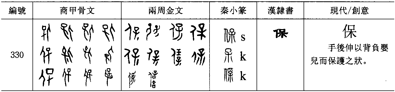 此外,本來形象是一體的,後來分割成兩部分,或違反自然的形象,或甚至不成形,自也是演變後的現象。其道理簡明,不必多言。如保字(字330)【 ,養也。从人省聲。,古文孚。 ,古文不省。 ,古文】本作一人背負小兒之狀,後來離析成兩部分。
