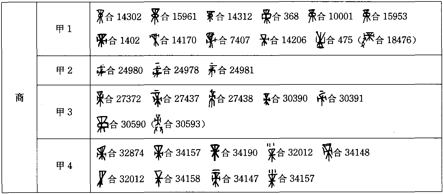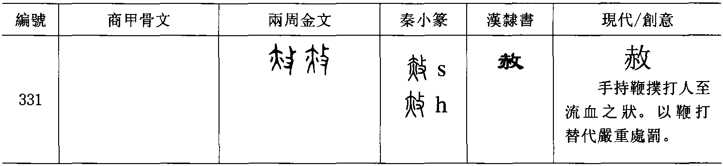 魯字(字237)作盤上美味的魚料理形 ( ), 盤子的□形錯成曰( ),訛變的字形自是較合理的字形為晚。 再如,舞字(字146)甲骨第一期作一正視之人兩手下垂持舞具跳舞之狀 ( )。 到了第四期或在所謂的王族卜辭中, 就有不少兩臂作平舉的 ( ), 這是不自然的姿態,是不明創意者依樣畫形所造成的錯誤,應是較遲之形,此形演變到春秋與戰國時代則發生減省人形的訛變。第四期與所謂的王族卜辭有同樣的錯誤,也指出其為同時代風氣的資訊。在一般的情況下,以寫實的程度作為判定字形演變方向的根據,要比單以年代條件更為可靠。(六)造字法: 形聲字較其象形、象意字的結構為晚的時代性 形聲字本是文字因引申或假借等應用,為別義而加上意符或標明音讀而增繁的過程中自然形成的。它讓字形易於規劃、分類及音讀,不但有意以此種新形式創造新字,也以便利的形聲字結構替代原有的象形、表意字,很少有反其道而行的。第五章討論形聲字舉了不少,如誥字(字214)本作雙手持長管樂器 ( )。 長管樂器是政府作公衆宣告的方式,其習慣或已改變,或為了標音,就改為形聲。這樣的例子甚多,虹字(字213)原作雙頭虹形 ( ),猴字(字210)為猴子的象形 ( ), 囿字(字45)為特定範圍内栽植草木的場所 ( ), 遲字(字230)作背負一人行走而致遲慢 ( ), 沈字(字209)為沈牛於河中之狀 ( ), 耤字(字199)本作一人以手持犁, 一足踏犁耕地之狀的表意字 ( ), 後加昔聲而成形聲字。 齒(字202)本也是純象形字 ( ), 後來標上止聲。寶(字289)本作屋中藏有貝、玉等貴重物品 ( ), 缶聲也是後加的形聲字。有時一字有筆劃相近的異形,如果其中一形屬形聲字,就可能是較晚之形。 如赦字(字331) 【 , 置也。 从攴, 赤聲。 , 赦或从亦】,西周金文由亦與攴構成,表現一手持杖撲打一大人而致流血之狀。不知是因字形訛變,還是以形聲取代,說文作从攴,赤聲,也是形聲的結構較象意結構晚的例子。