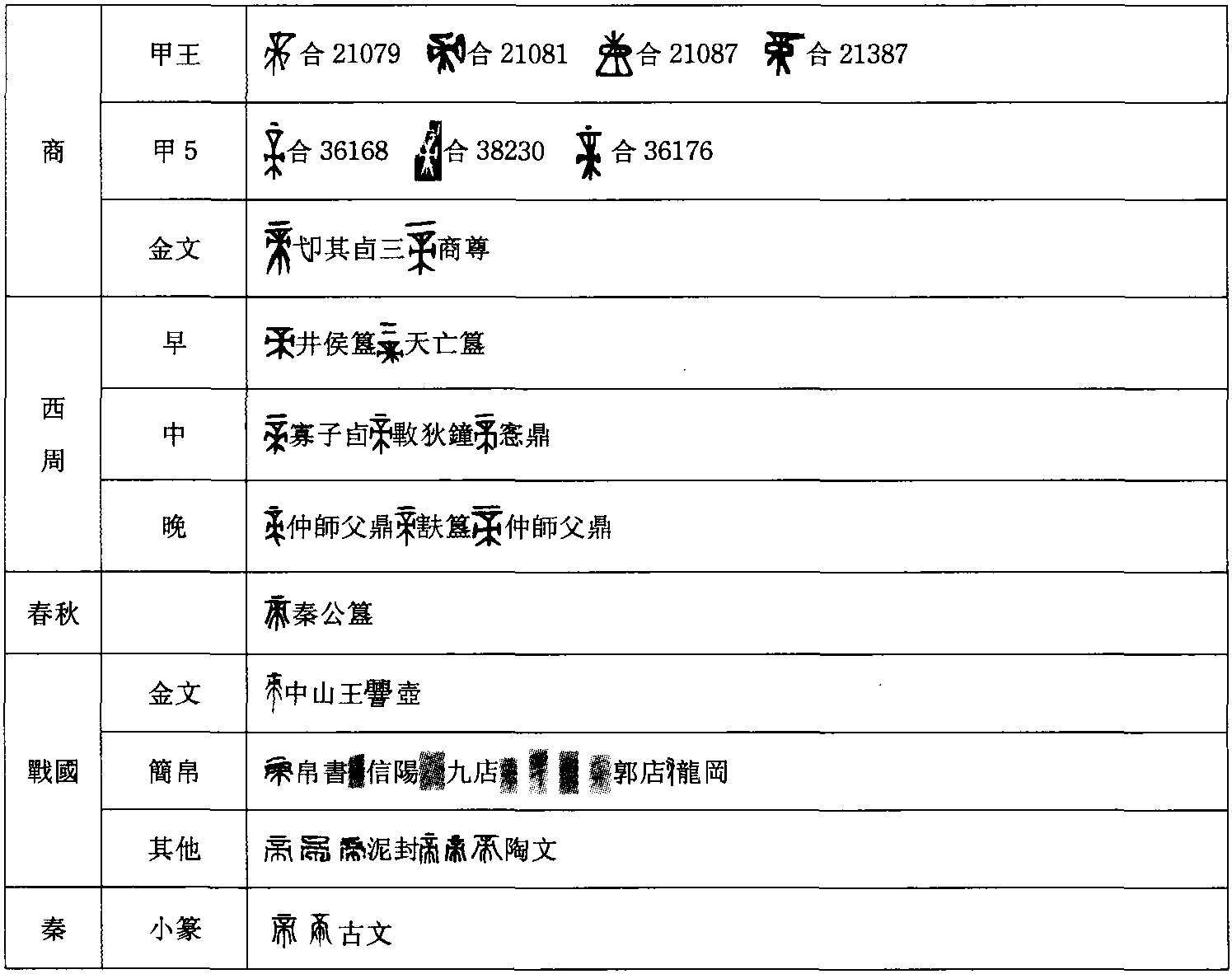 有時字的大小也會影響字形的選擇。如文(字1),早期的字形有作一人的胸上有交叉或心形的刻紋狀,另一形則省略胸上的刻紋。刺紋是古代喪葬時的美化儀式,所以銅器銘文多用作稱呼已過世的人,如前文人、文祖、文妣、文父、文母,故創意必是在胸上刻紋。如把刺紋省略,創意就不清楚。我們發現,甲骨卜辭的字小時,文就不寫刺紋的部分, 字大時就不省略, 如 《合》4611作交叉紋 ( ), 《合》18682作心紋 ( )。 因此可知, 空間容許時較會書寫較完整的字形, 字太小時只得省略某部分的字形。時代較晚的文件,可能因其使用的性質,有採用較之當代或前代一般的字形更為原始或寫實的習慣。再舉一個現在還常見的現象,現代一般所用的書體是楷書,但是圖章所用的書體卻常是秦漢時代的小篆。因此,文獻的年代不是判定字形演變方向的絕對標準,但文獻的性質是不能忽略的輔助標準。 書寫者的身份也是值得注意的,官方的文件往往較民間的保守而正確。官方公佈的文字,有充裕的時間書寫,而且意在展示,故一般較為謹慎,不隨意變動。民間的文化水平較低,同時為求快捷以應付增加的工作量,就喜歡省減筆劃,而且也比較不會因文字的潦草而受到處罰。由於他們的文化水平較低,所簡省的也往往是不當的部分,六朝的碑刻文字錯誤多,石工識字水平應是重要的因素。相對的,同時代的文字,簡帛或竹簡上的文字形體多有不同,一個字往往有二至四種形體。而銅器上的便顯得較單一,改變的程度比較小。銅器銘文較多官方的製作,簡帛文字則多私人的書寫,這也說明官方的文件書寫較謹慎,故有些學者就把金文視為正體,甲骨為俗體。正體就是在比較鄭重的場合使用的正體字,俗體就是日常使用的比較簡便的字體。 字形的演變有時也有地域性的習慣,如皇字(字195)為裝飾有孔雀羽毛的帽子形象 ( ), 到了春秋時代, 羽毛末稍豎劃各增一短橫, 戰國時代的曾侯乙鐘還保存羽毛的眼 ( ), 但楚系文字就把眼的部分省去了 ( )。 從創意的觀點看, 也應是較遲的字形。 同樣表現了曾、楚地域之異的例子,還有曾姬無卹壺的室字,其形符仍作屋形 ( ), 而楚系銅器及簡帛則常只保留屋脊的部分, 如客 ( 鑄客鼎)、室 ( 鑄客豆)、 寶 ( 欒書缶)。 楚地可能因進入中原的政治舞台較晚,使用漢字的時機較窄,水平也有差距,故常有省略的習慣,這也再次印證不能單據年代作為判定字形演變的方向,一定還要配合字的創意、字形演變規律、文獻性質等條件,才會得到較可靠的論定。(三)字的創意 就一般文字的演變方向看,為了整齊與美觀,繁雜的字形要簡省,簡易的字形就要增繁,使字的結構有適度的筆劃。譬如第五節所談的形聲字,其演化的過程,經常是為與假借或引申義分別而加上一個意符或聲符,其中可能也隱含有使筆劃適度的用意。又如全由聲符組成的形聲字,戰國時代假借為宮調的羽字加上于的聲符,假借為語詞的乎字加上虎聲,本字的筆劃都不多,也可能就是為了此原因,而不是聲讀起了變化,需要重新標上適當的聲符。 但有時兩個字形的筆劃相差不大,文獻的性質相近,年代也相若,就應另找演變趨向的條件,而字的創意也應是有效的參考條件之一。如果某字創意絕對重要的部分被省略了,就較可能是因後世不明創字的用意而簡省。如微(字265),甲骨文作一手持利器打殺病弱長髮老人之狀,而楚簡就有省去手持利器的部分。失去必要的棒擊動作,當然是變化後的字形。又如秦字(字309)作雙手持杵舂打兩束禾以製精米之狀( )。 如省去雙手 ( ), 也就失去必要的舂穀動作, 就是較遲的字形。 向下舂打的動作應持棍棒的上端, 則雙手下移的寫法 ( )也應是較遲的變化。灋(字25)的創意是如羊似鹿的廌獸,有判斷善惡的本事,而法律要求公正如水之保持平衡。廌是構成法字的絕對必要部分,省簡成水與去兩個構件組合的字形,就無法創造去除罪犯者的法律概念,所以被省去廌的字形,自是較遲的字形。如果一形的創意較合理,自也可以看作較早的字形,如望字(字144)象人豎起眼睛遠望之意。遠望以站在高地 ( )效果較平地好, 故站在平地 ( )的較可能是後來簡省的字形。創意必要部分被省掉了的字形,其時代比較晚,要解決有這種條件的字形演變方向比較容易。如果省略的部分並非是必要的,就比較難於判斷兩個字形之間到底是增加或減省的關係。雖然一般的情況是繁複的要求簡省,簡易的要求增繁,但有時字形已相當繁雜了,卻有人仍然覺得尚不夠達意而想加以補足,以下略舉數例: 秋(字50),甲骨文第一期作一隻蝗蟲之形。因它出現於夏秋之際,商代秋季包括夏季,故其意義,除蝗蟲外還代表秋季。第三期除此形外,多作一蝗蟲之下有火形,至第五期兩形並存。目前戰國的文獻作从禾从火或从日从秋。 《說文》的小篆作从禾从火, 籀文作从禾从 。如果從年代與字形的條件看,其最可能演變的過程是,先有蝗蟲之形,然後下加火,再加禾,然後省蝗蟲形,或省蝗蟲形而加日。但從創意的觀點看,蝗蟲的形狀易與其他昆蟲相混,故籀文的字形蝗蟲部分就錯成龜。但表現農民以火驅趕的景象,可能更易表現蝗蟲的種屬以及出現的季節,因而有火的字形有可能是較早的字形。