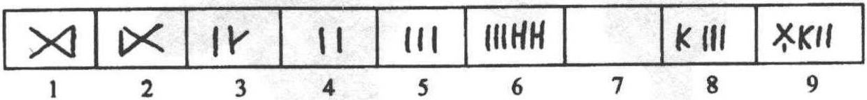 图2—10 例如居延汉简 “小大五十五物” , 刻齿为[ ]形五个加[ ]形五个; “钱三千三百五十”,刻齿为[ ]形三个加[ ]形三个再加[ ]形一个; “糜卅三石二斗”,刻齿为[ ]形三个加[ ]形三个再加[ ]形二个。☚ 叁 汉字产生的历程 [二]图画记事 ☛ |