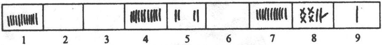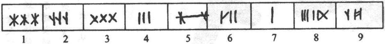 图2—9 哈尼族典当土地的木契 西藏的僜人有自己的语言,属汉藏语系藏缅语族,无文字,以刻木、结绳、摆木棍或树枝记事。比如僜人借债时就是在板壁上刻道记数。其他实物记事的方式还有用不同的事物代表不同的事情,这也是在现代无文字的许多民族中能见到的方式,比如黔东南的苗族用黄豆的数量来记录劳动的工分数,一粒黄豆代表一个工分。 以上案例和文献的记载表明,契刻符号虽然还不是文字,但曾经发挥过帮助记忆、传递某种信息、作契约凭证等记事作用,但正如郭沫若所说,这些符号是原始汉字的一个源头,古人利用这种形式,把一些数字符号或象形符号刻画在陶器或竹木片上,用以传递某种信息,由此就有可能逐渐演化成类似青铜器上的族徽文或是竹简木牍这类的文书,文字和文献也就逐渐地形成了。由此可以认为,契刻比结绳和其他方式的文字起源 (如八卦等)传说都更具促进文字产生的条件。 事实上,汉字中的许多文字,其最早的字源,应该就是刻画符号。地下出土的秦汉简牍表明,先秦和秦汉的简牍时代里,社会上曾实行过一种刻齿计数的方法,随着纸张取代简牍,这套计数的方法便失传了。1996年日本学者籾山明 《刻齿简牍初探——汉简形态论》(载日本 《木简研究》第十七号)一文,发现了刻齿符号与所示的数字之间的对应规律,使以往看似没有差别的刻齿成了可以释读的数码,特定的木简刻齿表示特定的基本数字,其对应关系 (如图2—10) :