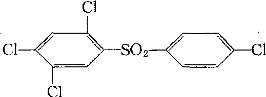 三氯杀螨砜tetradifon又称TDN。有机氯类杀螨剂。化学名称:2,4,5,4′-四氯二苯砜。化学结构式如下。纯品为无色无味结晶,熔点145~146℃,20℃时蒸气压为320.0 ×10-10 Pa,挥发性很小。几乎不溶于水,微溶于丙酮、醇,较易溶于氯仿、苯和二恶烷。对酸、碱、高温及紫外线稳定。对螨卵有强触杀作用,影响螨卵的发育,使卵不能孵化,并能破坏雌成螨的生殖机能,造成雌螨不育。对初孵幼螨也有良好的杀灭效果,可以杀死对有机磷农药产生抗性的螨类。喷洒叶片后,有一定渗透作用,杀死叶片另一面的螨卵。可以防治棉花、柑橘及其他大田作物的叶螨及其他螨类。在螨卵盛期或成螨最少期施药。残效期25天左右。对高等动物几乎无毒,大鼠急性口服LD50>14 700 mg/kg,兔急性经皮LD50为10 000 mg/kg。