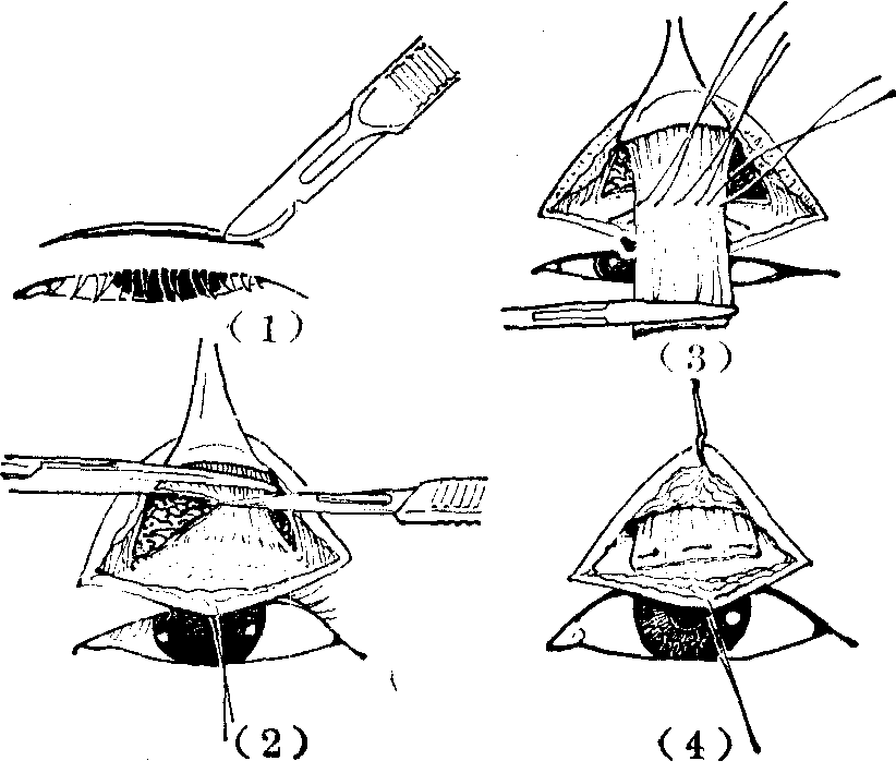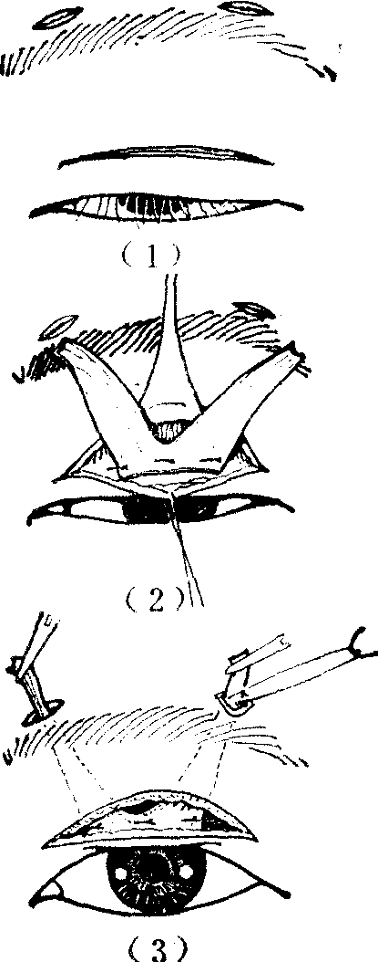 图2 皮肤经路上睑提肌缩短术 利用额肌悬吊加强或代行上睑提肌功能的手术,其基本原则是采用组织或组织代用品植入所剥离的皮下隧道内,连接于额肌和上睑之间,借助额肌的收缩提拉上睑,张大睑裂。组织移植,可用自体阔筋膜;组织代用品,如可用尼隆缝线、硅胶薄膜等。其中以自体筋膜为最常用,可行条状或片状移植,并有山字形、V字形、U字形、W字形等多种术式。筋膜的上端与额肌缝合固定,下端缝合在睑板上半的前侧(图3)。此外,有分离一束额肌形成肌瓣,向下牵拉直接与睑板缝合的方法。此类手术术后,每当张眼时,即伴随出现皱眉耸眉等不自然姿态,如下垂限于一侧,则左右对比益为明显。