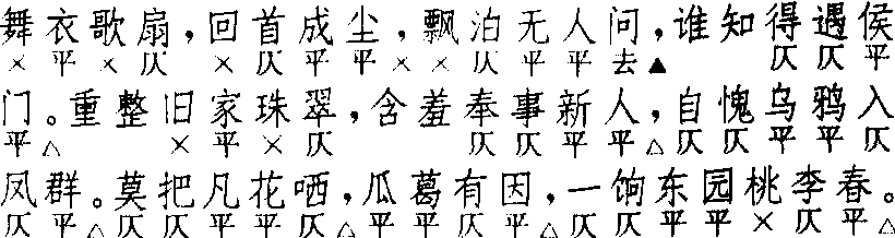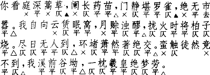 | 释义 | 下山虎 下山虎陆采 《明珠记》 ![]() 全曲十句:4,4△。5▲,4△。4,4△,7△。5△,4△,7△。 其二 徐复祚 《投梭记》 ![]() 全曲十二句:4▲,4△,5▲,4△。4,4△,7△。5△,7△。5△,4△,7△。第一式较第二式少第八、九两句,亦见于《狮吼记·顶灯》、《琴心记 ·私通侍者》、《锦笺记 ·协奏》、《节侠记·闻谪》。早期戏文《白兔记·牧牛》、《杀狗记·雪中救兄》皆为此式,明人不甚用之。第二式为通行格式,始于《琵琶记·拐儿绐误》、《荆钗记·就禄》,仅个别句式略有不同。〔下山虎〕皆以一支入套,连用二支者不多。以〔下山虎〕为主的集曲有〔山桃红〕、〔山虎看桃〕、〔山下夭桃〕、〔山虎嵌蛮牌〕、〔山云江风娇〕、〔下山遇多娇〕、〔忆虎序〕,见《南词简谱》。 ☚ 山桃红 蛮牌令 ☛ ![]() ![]() |