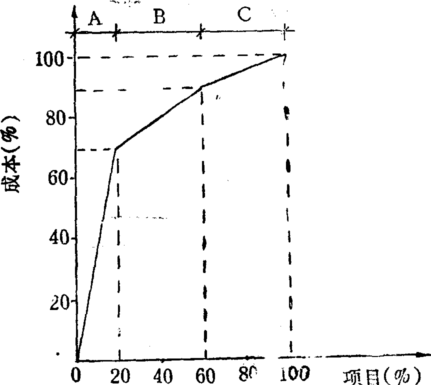 不均匀分布定律法亦称“排列图法或帕雷特分析法”。它是根据意大利经济学家帕雷特于1897年在研究个人财富状况时发现的反映“关键的少数和次要的多数”的帕雷特曲线,由劳伦斯(M.O.Lorenz)、增山元郎、戴克(H.F.Dickie)等逐渐推广、运用而发展起来的一种分析方法。其指导思想是分析事物的诸要素中,哪些是主要的,哪些是次要的,进行分类排队,分清重点和一般,进行有区别的分类管理。由于它把分析的对象分为A.B.C三类,故又称为ABC分析法。它的基本步骤如下: (1) 搜集有关数据; (2) 统计汇总; (3)绘制ABC分析表。一般地,对于A类部件,其中种类约占20%,而费用占70%左右; 对于B类,其种类约占40%,而成本占20%左右;对于C类,其种类约占40%,而费用仅占10%左右。这说明A类部件应作为价值分析的主攻对象,B类部件可作为一般分析对象,C类部件可不作分析。 (4)绘制ABC分析图。如图示。