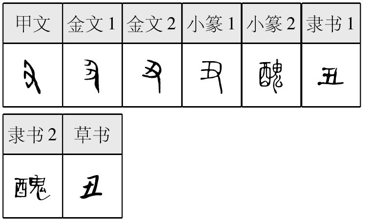 丑 甲骨文; 金文; 篆chǒu[獨體象形,《説文》:“丑,紐也。十二月。萬物動,用事。象手之形。時加丑。亦舉手時也。凡丑之屬皆從丑。”不確。丑,初文像彎了指頭的手在做扭物之狀。擬爲扭本字。借爲地支的第二位,十二時辰之一,相當於一時至三時。丑年屬牛。乙丑、丁丑、己丑、辛丑、癸丑都是牛年。丑角,即小花臉或三花臉。] 郭沫若《洪波曲·第八章》:“楚劇班的隊長我記得是王若愚,本來是演丑角的。” 丑(chǒu)“ ,纽也。十二月,万物动,用事。象手之形。时加丑,亦举手时也。凡丑之属皆从丑。”(敕九切) 许慎这里用“纽”来解释“丑”,为声训。古以十二地支纪月,“丑”表示夏历十二月。此时阴气渐解,阳气开始上腾,将用农事,必用手去操持。 甲骨文有 、 等,金文有 、 、 等形,郭沫若说是古爪字。春秋金文或加“手”,作 ;战国楚简亦有类似写法,作 。太炎先生云:“杻,手梏也。丑象手梏。”徐复说:“丑为纽手,字亦作杽。木部:‘杽,械也。从木,从手。手亦声。敕九切’《广雅·释言》:‘杽谓之梏。’今谓手铐。”[1]姚孝遂说:“‘丑’本象手有甲形,为 之本字。《说文》训‘ ’为‘手足甲’。徐灏《段注笺》云: 字‘本象手甲,故从又,引申而兼足甲也’。卜辞均假作干支字。”[2]陆宗达、王宁两位先生说“丑”象手之形,可以从“丑”的同源字来证明。如:“ ,食肉也。”“羞,进献也。”“狃”为猿属,亦善用爪攀缘。[3] 丑部有两个属字。如“羞”字下云:“进献也。从羊,羊,所进也。” 丑 chǒu(4画)