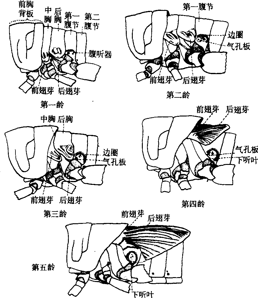 图1 蝗蝻各龄期的触角 生物学特性 东亚飞蝗无真正滞育现象; 发生期与世代数随不同纬度及海拔高度的气候条件而异。在黄(河)、淮(河)、海(河)下游年发生2代,个别年份和地区出现3代。第一代夏蝗5月中下旬孵化,6月中下旬至7月上旬羽化为成虫; 第三代蝗虫7月中下旬至8月上旬孵化,8月中下旬至9月上旬羽化成虫。个别年有提早或推迟孵化现象(见有效积温法则)。孵化期的差异还受所在地形、方位、植被的稀疏和土壤理化特性的影响;地形较高、植被稀疏或向阳地段蝗卵发育较快。通常晴天时,整个白天均可孵化,但从11~13时最多。阴天孵化较少,雨天更少,而小雨后的晴天孵化较整齐。整个卵囊自开始至全部孵化完毕,一般需50~60分钟。在湖、河水位波及地区,蝗卵有随水位下退而陆续孵化现象,甚至可延续一个月。