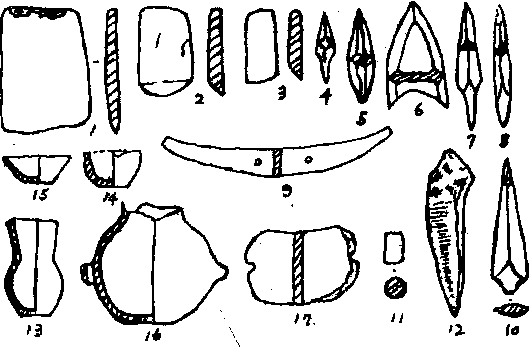 (1.石斧2、3.石锛、4—8.石镞9.石刀10.石矛11. 白石管12.骨锥13.陶壶14.陶钵.15.陶碗.16.陶罐17.陶网坠) |