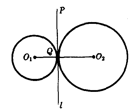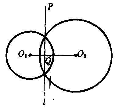 对于不同心的两定圆有等幂的点的轨迹,叫做两圆的等幂轴.等幂轴是垂直于两圆连心线的一条直线.如图,设动点P对于不同心的两定圆⊙O1(r1)和⊙O2 (r2)的幂分别为p1,p2;连结PO1,PO2,则p1=PO21-r21,p2=PO22-r22.因为p1=p2,所以PO21-r21=PO22-r22.因此PO21-PO22=r21-r22.可以看出,P点的轨迹是垂直于连心线O1O2的一条直线l,垂足Q的位置可确定(参见“定差幂线).
