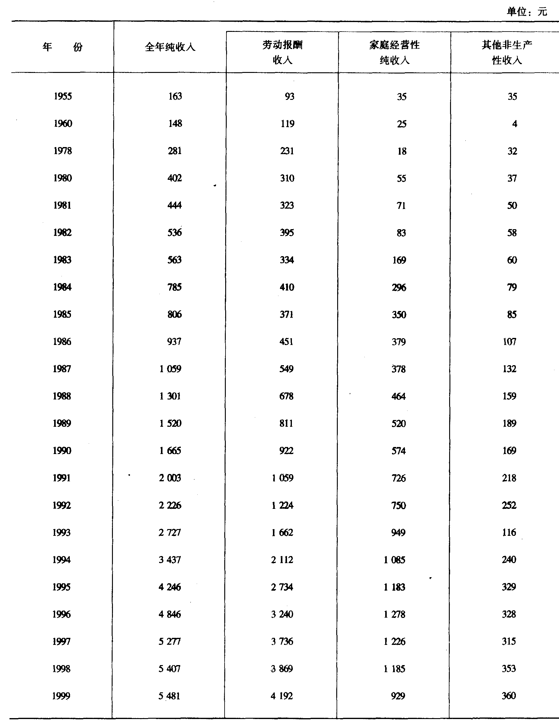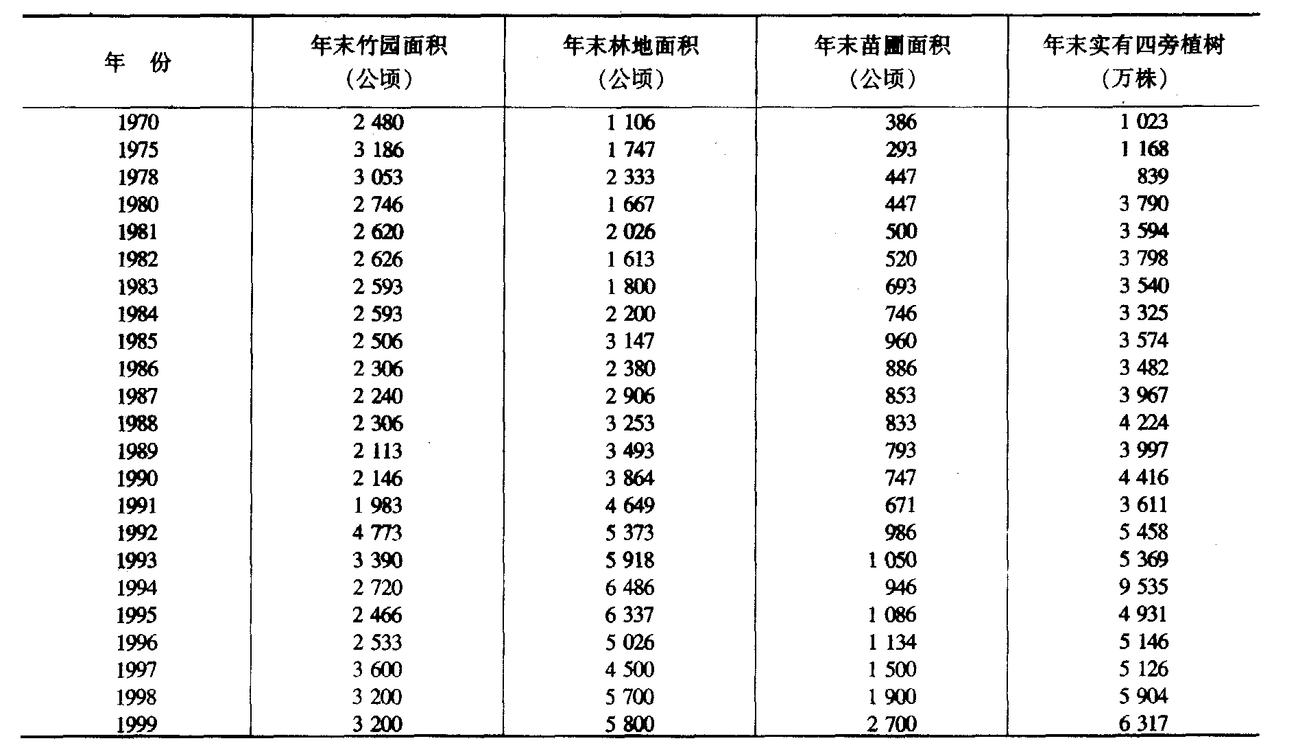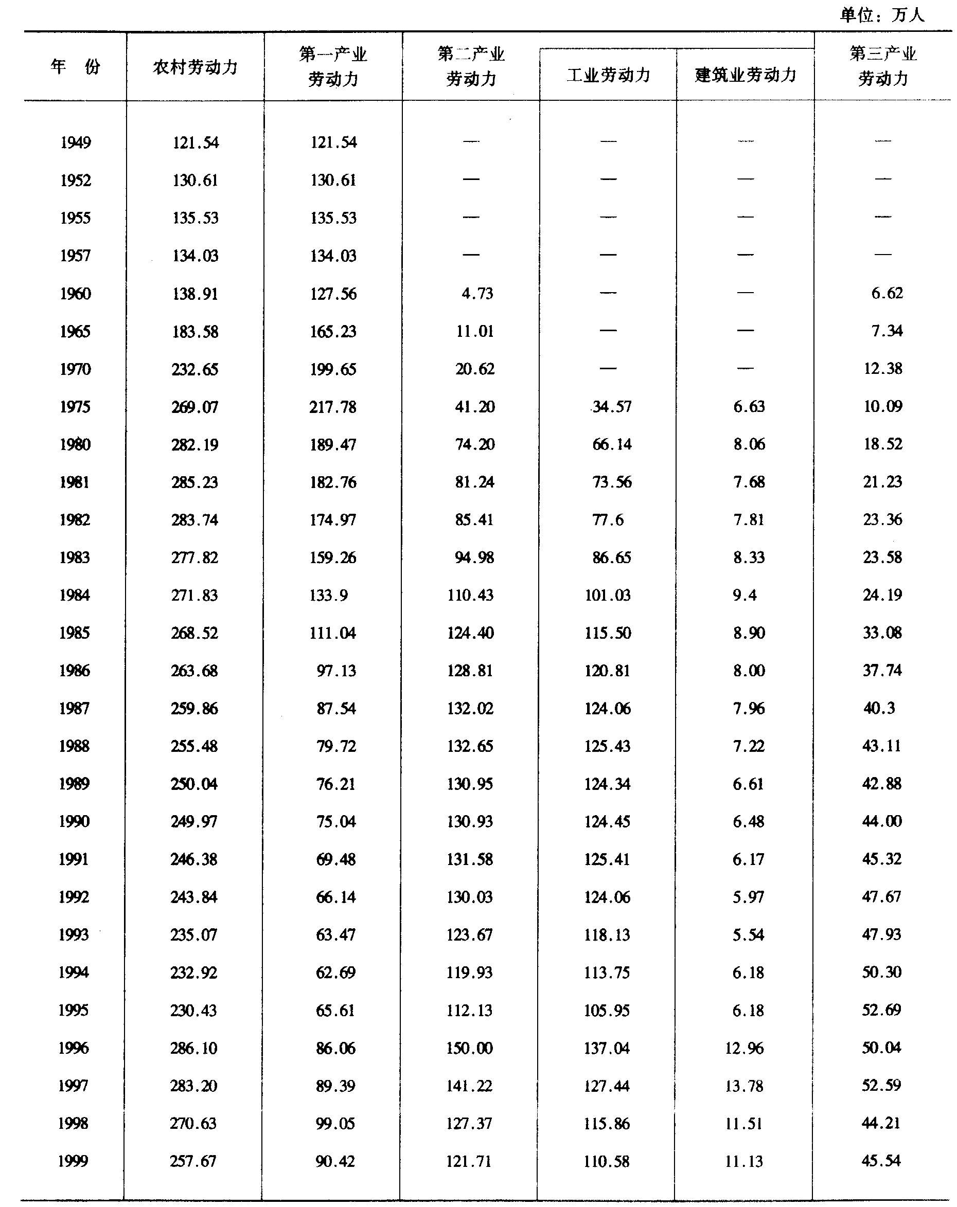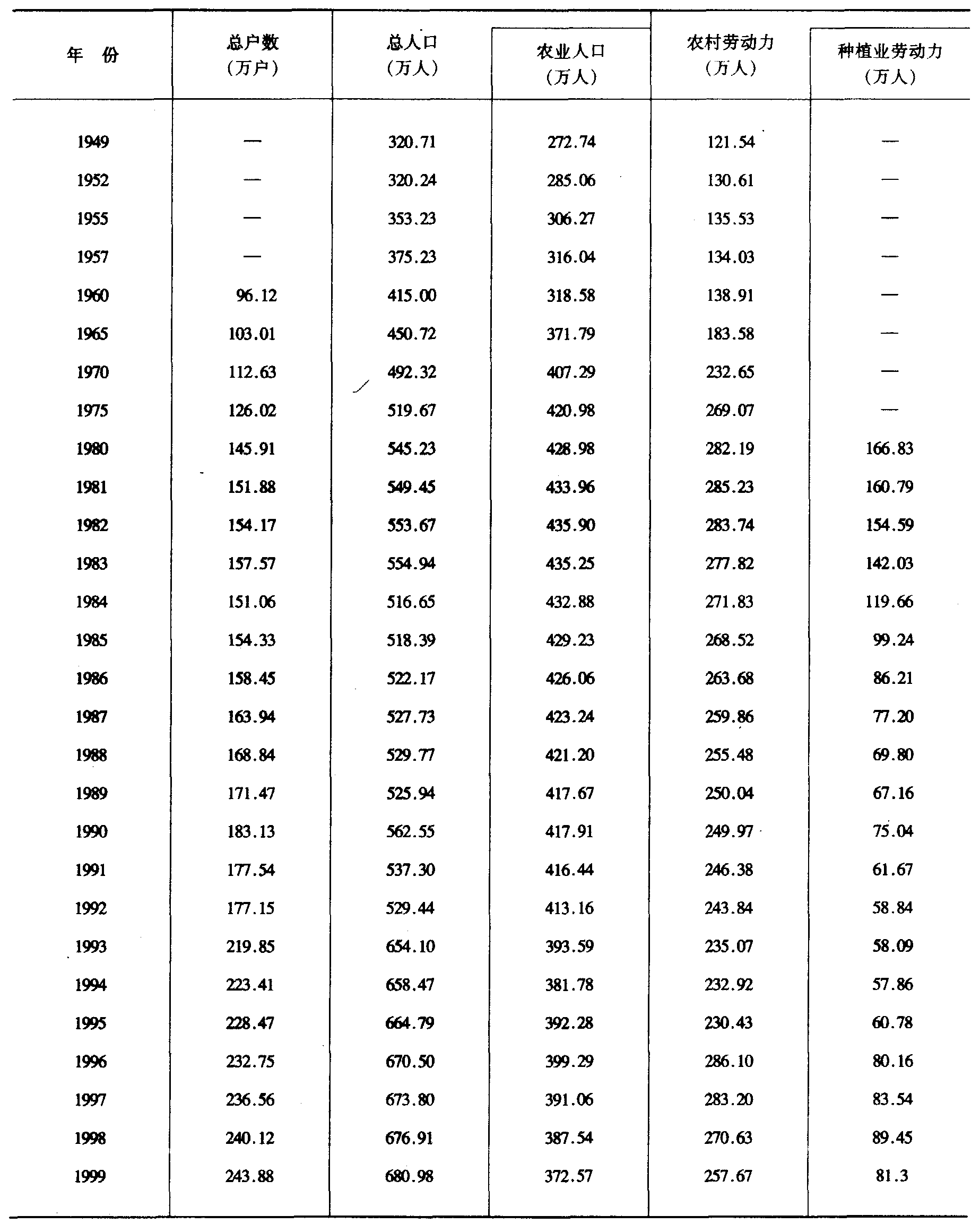 注:1.总户数、总人口是公安局户籍资料。 2.1980年以前种植业劳动力没有单列统计。 四、农村劳动力按业别划分