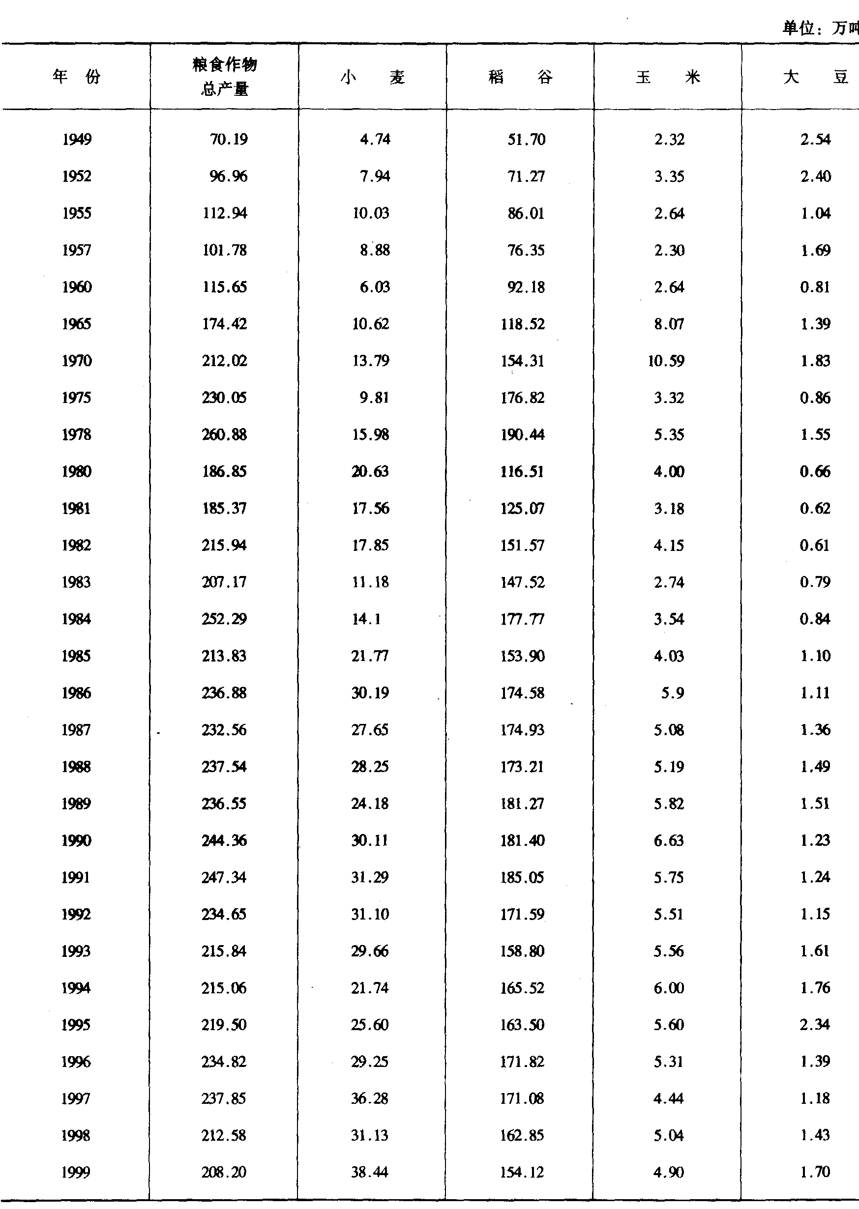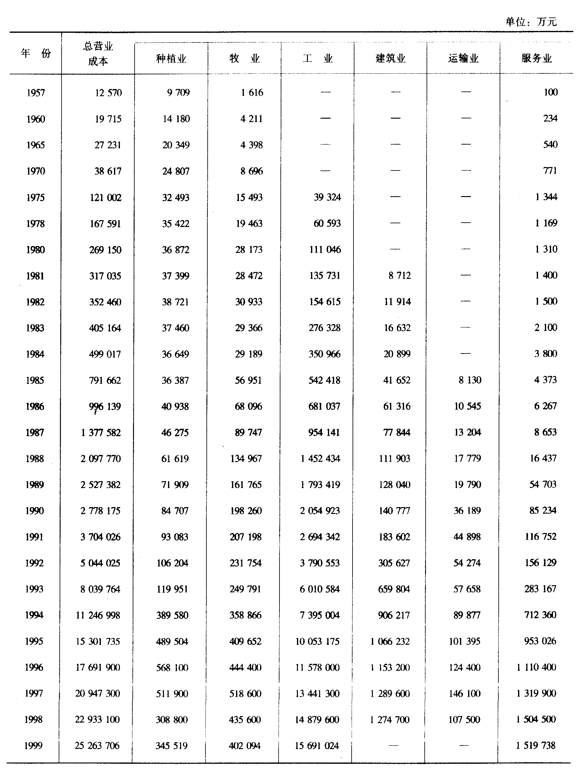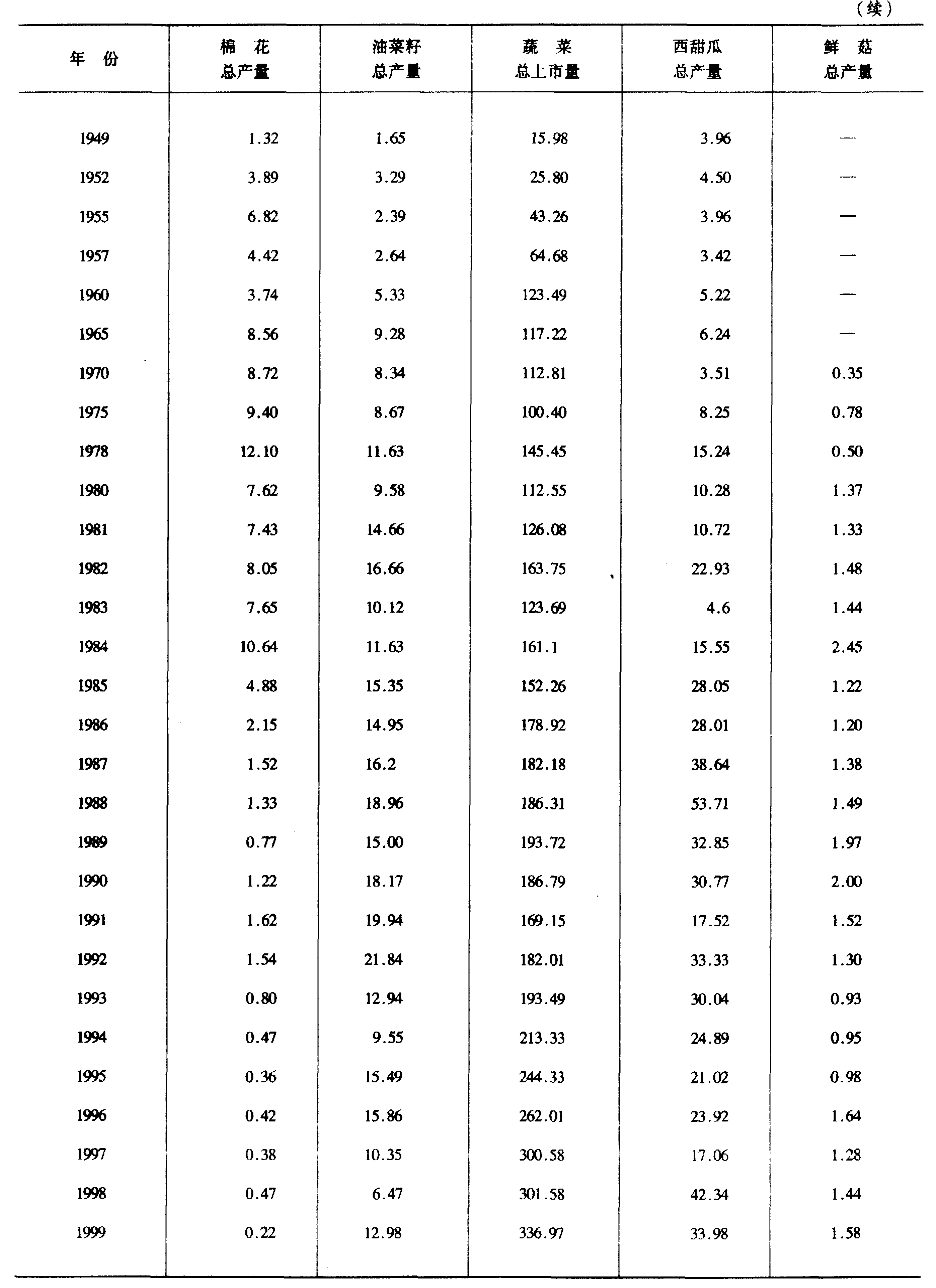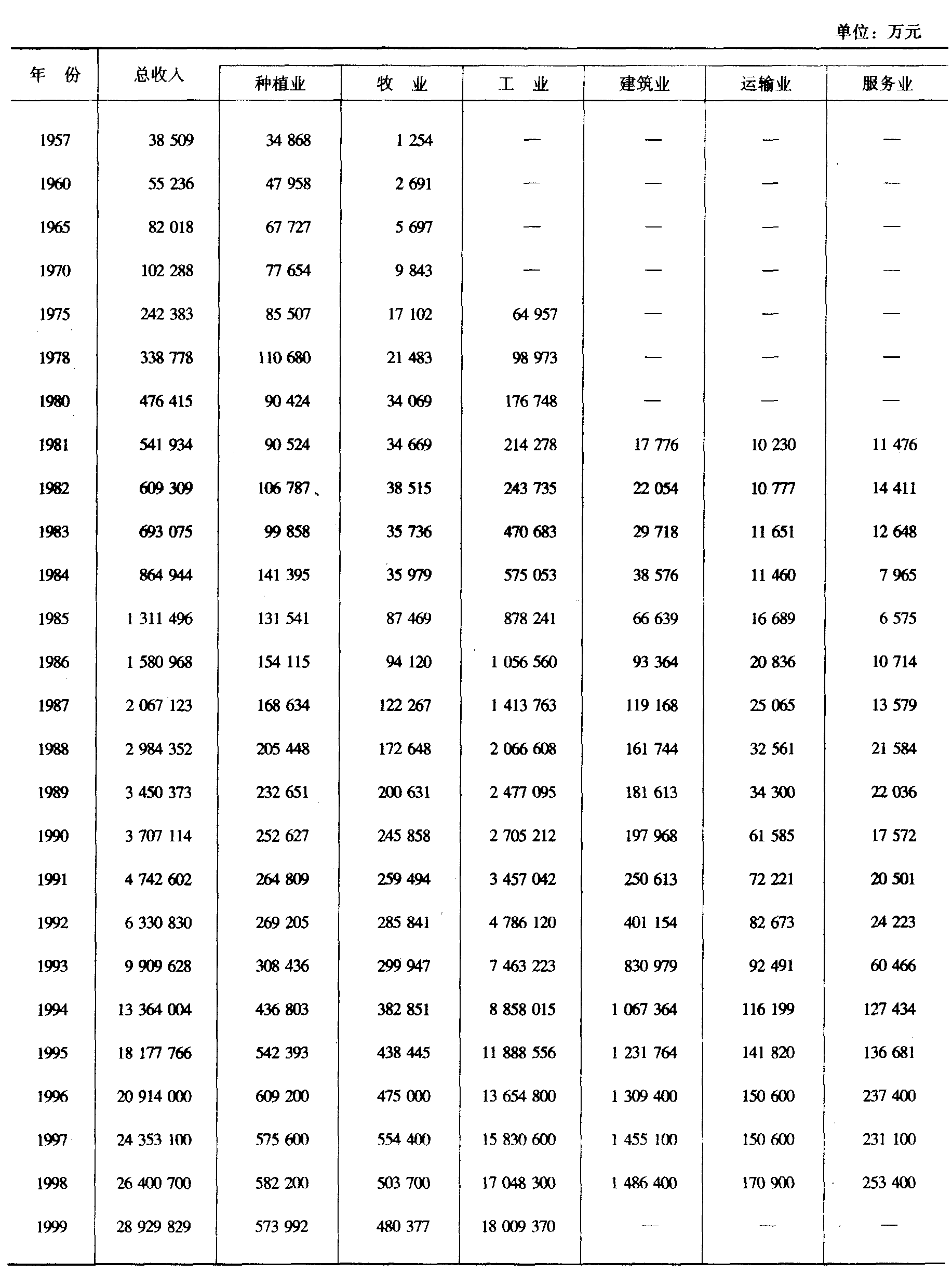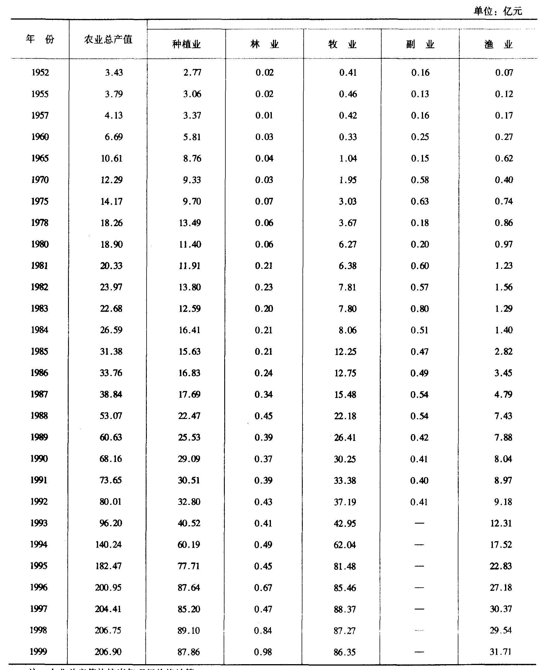 注:农业总产值均按当年现行价格计算。 1993年国家统计局新规定的农业总产值统计制度取消了副业单列统计,其捕猎和采集野生动植物产值分别归入林业和牧业统计。 十、农业总产值指数(以1952年为基数1952=100)
