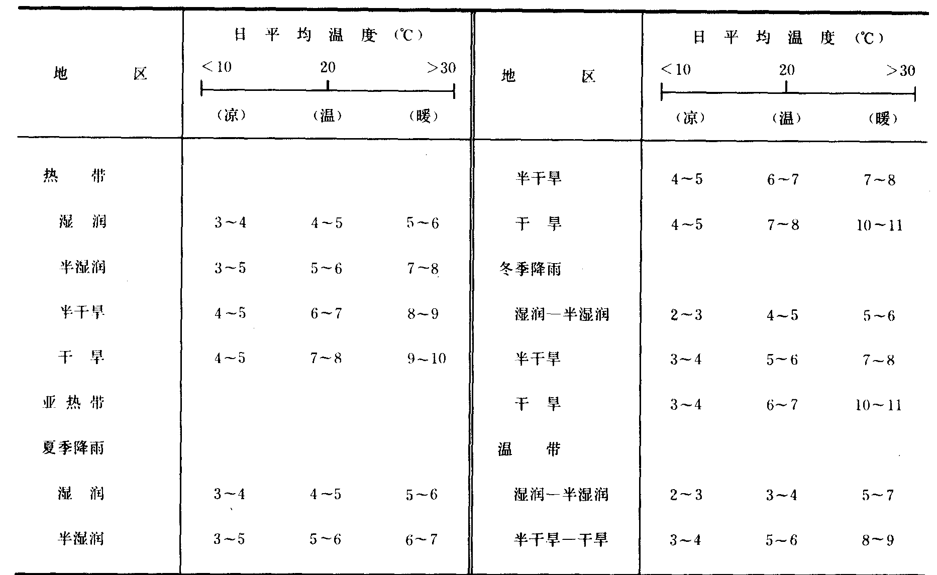 表9 不同平均温度下的作物干物质生产率(Ym, kg·ha-1·h-1) | 作物类别 | 平 均 温 度 (℃) | 作 物 类 别 举 例 (品种) | | 5 | 10 | 15 | 20 | 25 | 30 | 35 | 40 | 45 | | 第Ⅰ类耐寒作物 | 5 | 15 | 20 | 20 | 15 | 5 | 0 | 0 | 0 | 苜蓿、 菜豆、 甘蓝、 豌豆、 马铃薯、 番茄、 糖 用甜菜、 小麦 | | 第Ⅰ类喜温作物 | 0 | 0 | 15 | 32.5 | 35 | 35 | 32.5 | 5 | 0 | 苜蓿、 柑桔、 棉花、 花生、 胡椒、 水稻、红花、 大豆、 向日葵、 烟草、 番茄 | | 第Ⅱ类耐寒作物 | 0 | 5 | 45 | 65 | 65 | 65 | 45 | 5 | 0 | 某些玉米和高粱品种 | | 第Ⅱ类喜温作物 | 0 | 0 | 5 | 45 | 65 | 65 | 65* | 45 | 5 | 玉米、 高粱、 甘蔗 |