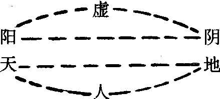 中国传统宇宙论的另一基本思想是三才“天地人”,它与“三”的观念(虚-阴-阳)有密切联系。“天”代表“阳”,“地”代表“阴”。至于“人”,在精神上具有“天地”的效能,其内心包含着“虚”的本质。人在此被提升到特别尊严的地位,因为他作为第三个成员参与宇宙的创造过程。于是“虚实”、“阴阳”、“天地人”组成了三种关系轴与等级轴,中国宇宙论据此建立了起来: