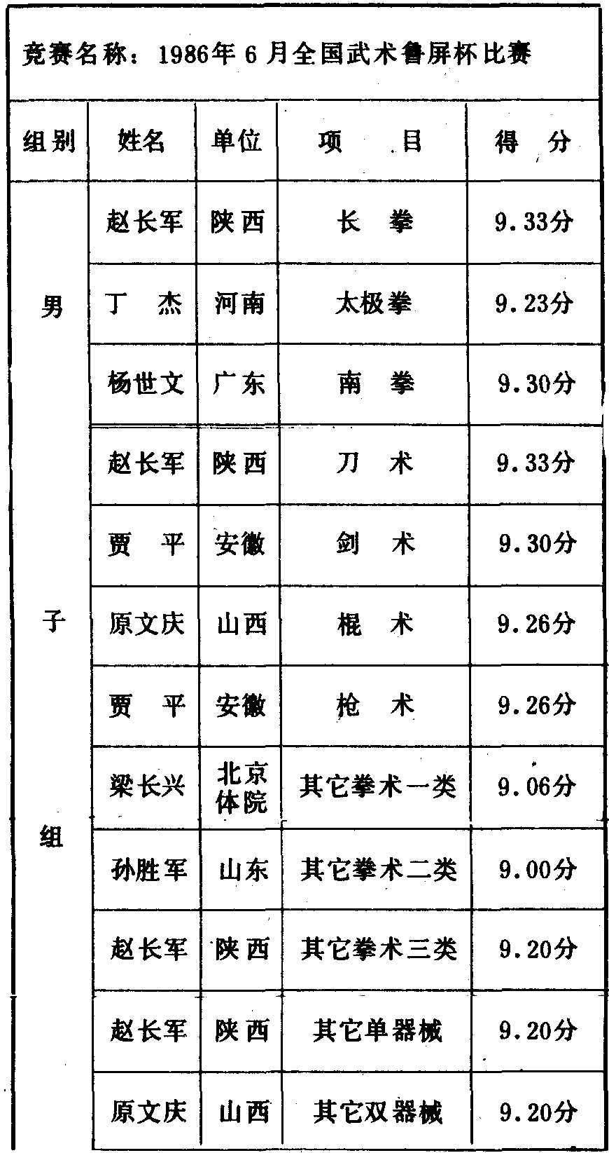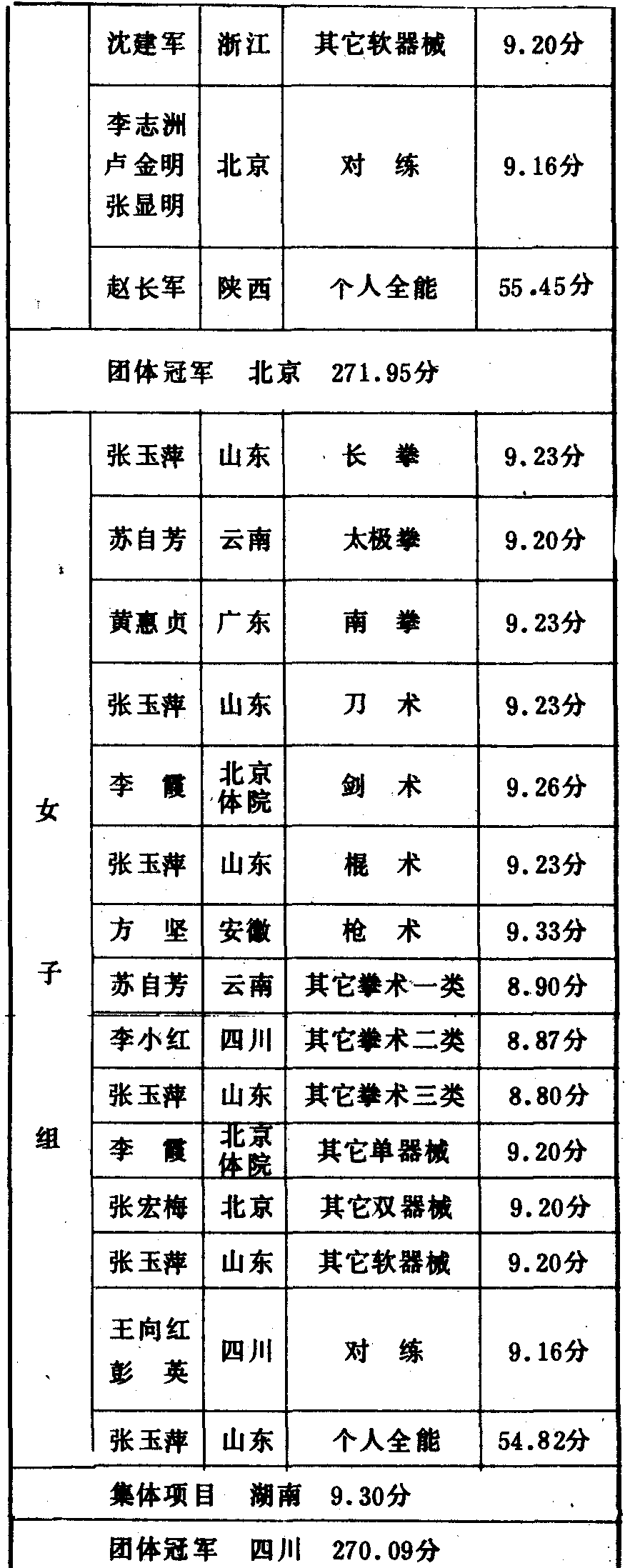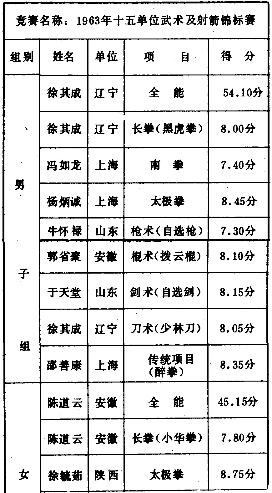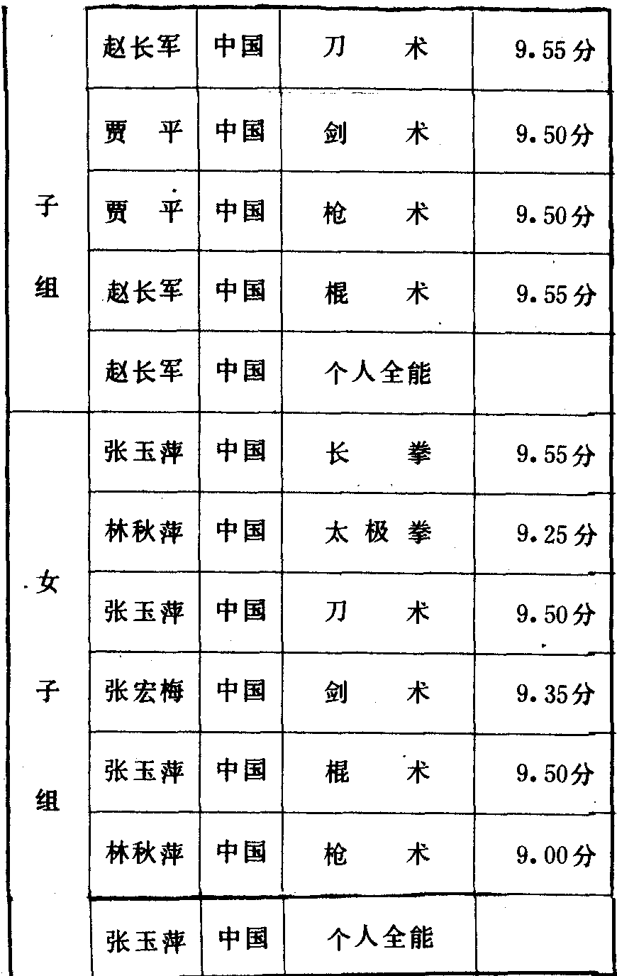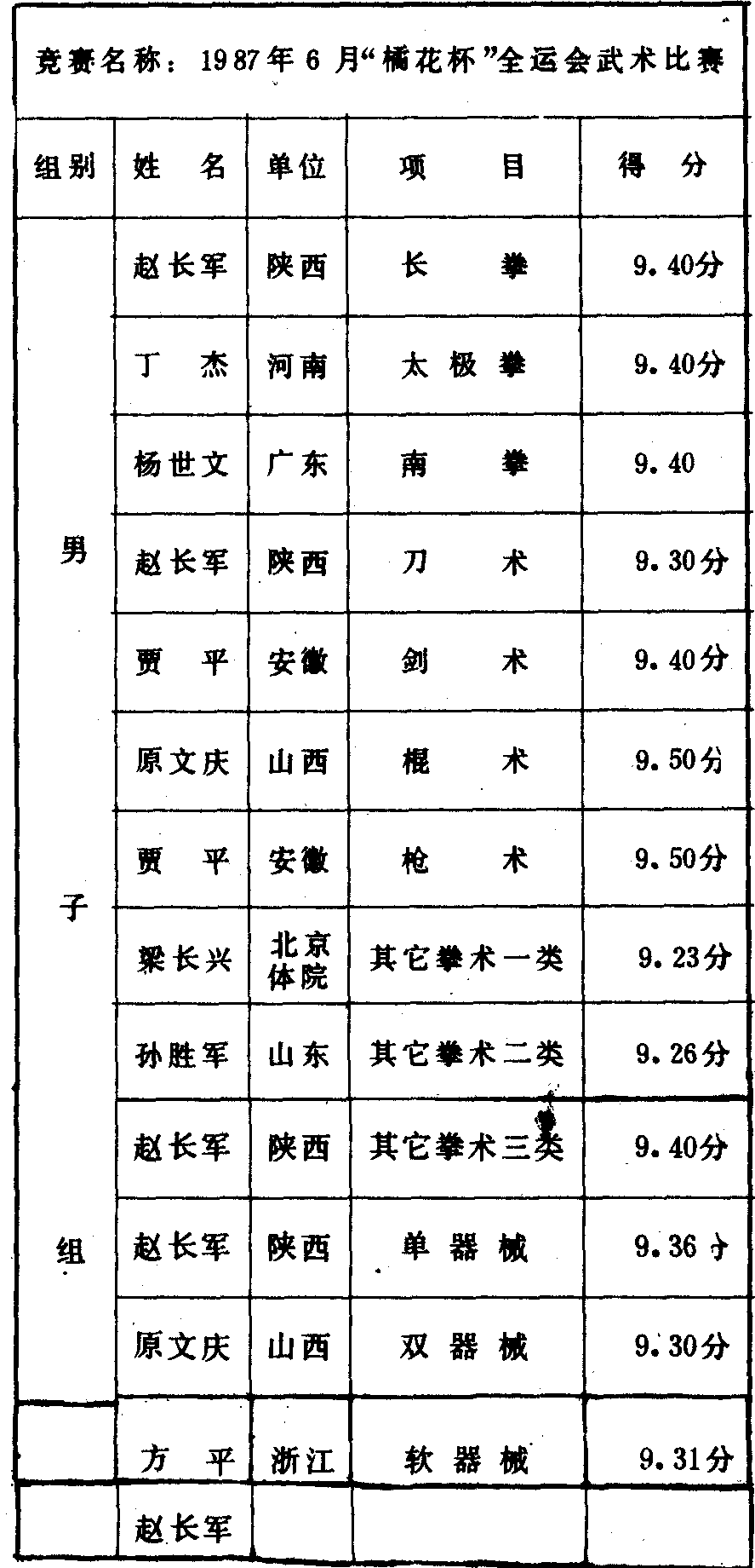 历届全国武术比赛冠军一览表