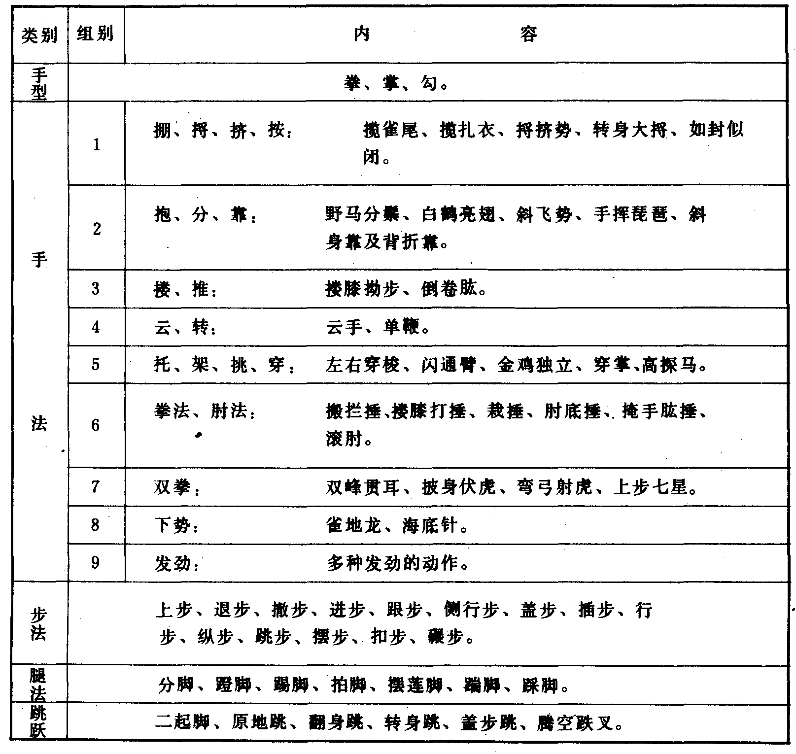 太极拳主要动作组别表