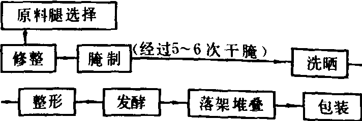 | 释义 | 中国火腿加工Chinese ham processing将整只猪后腿经整形、腌制、洗晒和发酵并保持原型的加工过程。中国火腿是著名的腌腊制品, 皮薄肉嫩,色泽鲜艳, 味香浓郁, 造型独特。中国火腿的种类习惯于以产地而命名, 如浙江省的金华火腿, 江苏省的如皋火腿, 宣威火腿等。在诸多种类火腿中以金华火腿最负盛名,历代作为贡品。1915年曾获巴拿马商品博览会一等优胜金质奖,1981年特级火腿获国家金质奖。