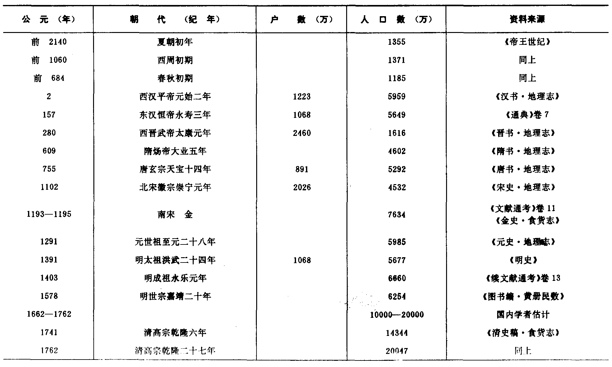注:1.本表全国和分地区数字是根据1988年人口变动情况抽样调查推算。其中,上海、江苏、浙江、安徽、广西、西藏、宁夏、新疆年末总人口数和人口自然增长率数为公安机关户籍统计数。2.全国总人口包括现役军人数,各地区均不包括。3.台湾省资料暂缺。11—2 中国历代人口 单位:万人