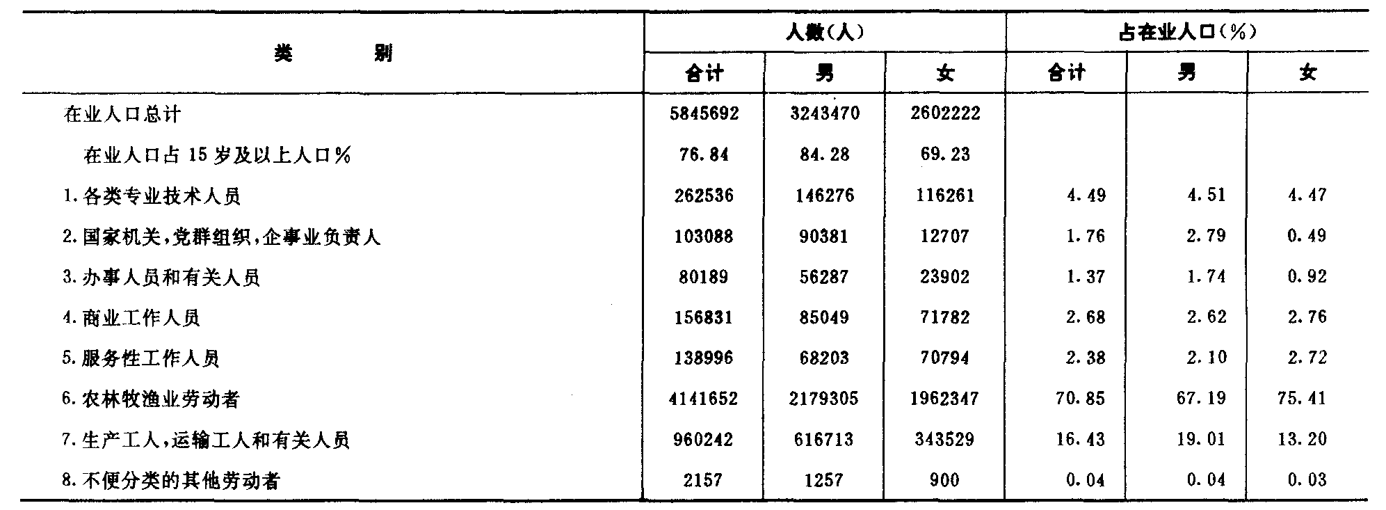 注:1.本表各年人口包括大陆29个省、自治区、直辖市和现役军人数字。2.市镇总人口是指辖区内全部人口:乡村总人口是指县人口,但不包括镇人口。1984年建镇标准有调整,新建镇较多,因此1984年以来市镇总人口增加较多。3.1982年以后数字,是根据1982年人口普查数字和历年的人口变动抽样调整数据推算的。11—4 分 行 业 人 口 (1987年1%人口抽样调查资料)