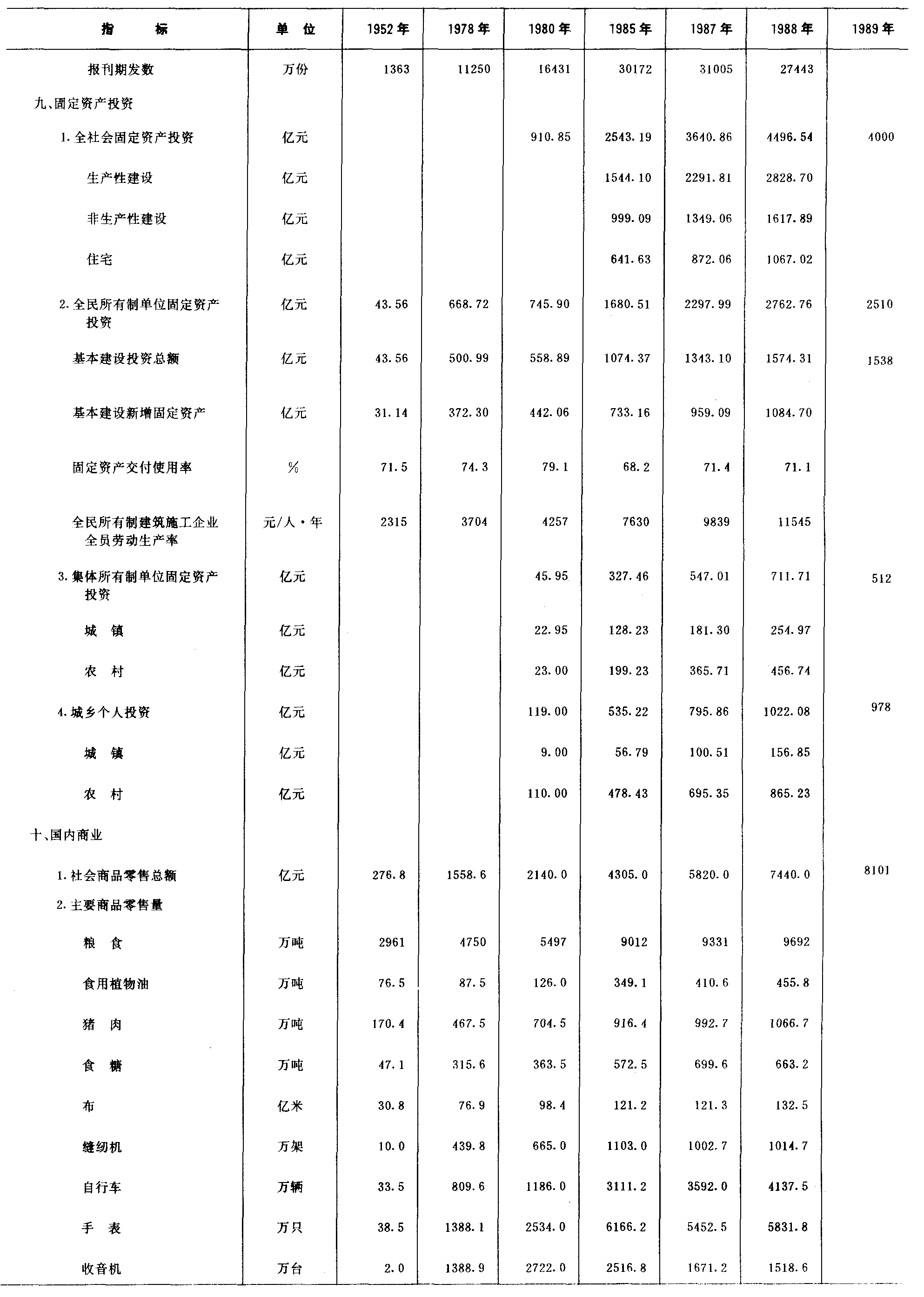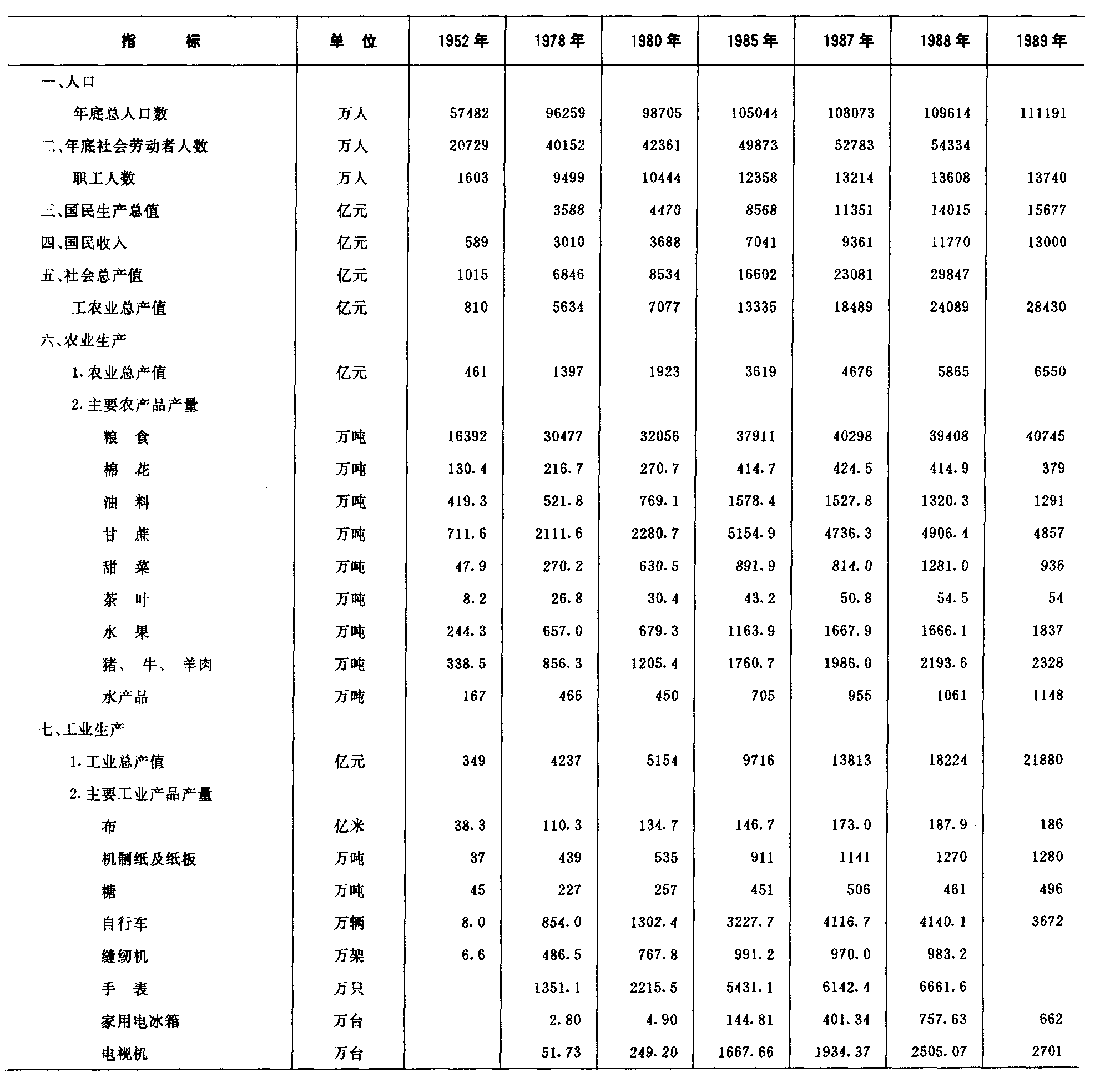 注:1.全民所有制独立核算工业企业全员劳动生产率,按1980年不变价格计算;2.1980年以后货物周转量包括公路运输中社会车辆完成数,1985年及以后还包括私营运输完成的数量;3.1987、1988年沿海主要港口货物吞吐量如包括龙口、威海等10个中型港口数字应为39625和43814;4.邮电业务总量,1981年以前按1970年不变价格计算,以后按1980年不变价格计算。5.1952、1978年对外贸易数字为经贸部统计数,1980年以后为海关统计数。6.1988年财政收支为初步数。 |