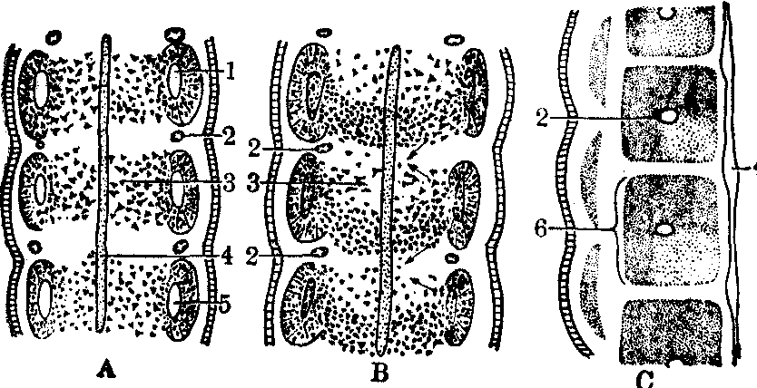 图3 胸骨的发生 A.第6周,胸部出现左、右间充质细胞带 B.第8周,软骨前期,左、右细胞带向中线靠拢,并开始在头端愈合 C.软骨化后的胸骨,每一胸骨段各有一骨化中心(第51/2月) 1.胸骨柄 2.胸骨体 3.剑突 ☚ 骨的组织发生 颅骨的发生 ☛ |