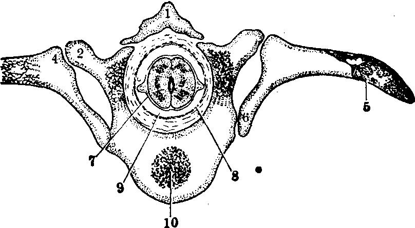 图1 椎骨形成过程半模式图 A.生骨节细胞移向脊索 B.箭头表示两个相邻生骨节各半形成一个椎体 C.5mm人胚,示椎骨始基的形成 1.体节 2.节间动脉 3.生骨节细胞 4.脊索5.肌腔 6.椎骨始基 位于椎体之间的间充质则密集成为椎间盘,该区残留的脊索膨大,将成为椎间盘胶冻状的髓核。 6~7周时,上述的原基软骨化,形成为软骨性椎骨。从第9周开始,在软骨性椎骨中出现三个骨化中心。一个在原始椎体中心;另两个左、右椎弓各一(图2),它们一般是在出生后数年完全骨化并连合。骶椎骨与尾骨约在青春期至25岁之间才连合成一块骨化骨。