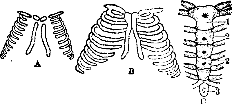 图2 肋骨与椎骨的骨化中心,12周人胎椎骨与肋骨横切 1.相邻的椎骨棘突 2.横突 3.椎弓骨化中心 4.肋骨结节(未钙化) 5.肋骨骨化中心(肋骨体) 6.肋骨头 7.软脊膜 8.硬脊膜 9.蜘蛛膜下腔 10.椎体骨化中心 肋骨的发生 肋骨是由椎骨始基的肋突发生而来。在正常情况下,只在胸区形成长肋,其它部位的肋突均消失。肋骨原基在第7周软骨化为软骨性肋,在第9周开始出现骨化中心。肋骨的骨化中心有三个: 一个在肋骨干,一个在肋结节,另一个在肋小头(图2)。它们出现的时间比椎骨骨化中心为早,但所有肋骨的远端则终生保留为软骨。肋骨与椎骨间有滑液性关节相连接。向腹侧面则与胸骨连接。 胸骨的发生 胸骨开始发生于胚胎发育的第6周。先在胸部的腹外侧左、右各出现一条致密的间充质细胞带(图3,A),在软骨前期,它们彼此向中线靠拢(图3,B)并逐渐自头向尾互相愈合。软骨化后,其头端出现两个小软骨块,名为胸骨上软骨。以后形成胸骨柄的一部分,并与锁骨的关节连接。其体尾端则自行分化为7~8小段,称为胸骨段,将形成为胸骨本体,与肋骨相关节。在进行骨化时,每一胸骨段各有一骨化中心(图3C)。骨化约开始于第5月,但各胸骨段愈合和完成骨化过程则需到青春期。