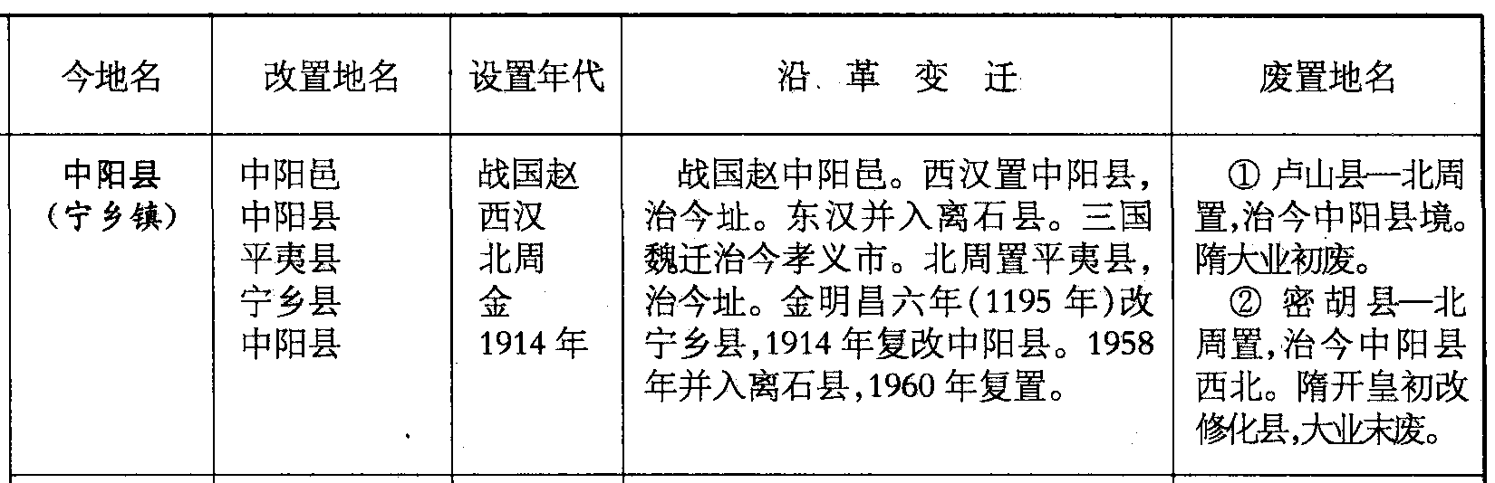 中阳县(宁乡镇)中阳邑中阳县平夷县宁乡县中阳县战国赵西汉北周金1914年战国赵中阳邑。西汉置中阳县,治今址。东汉并入离石县。三国魏迁治今孝义市。北周置平夷县,治今址。金明昌六年(1195年)改宁乡县,1914年复改中阳县。1958年并入离石县,1960年复置。❶卢山县—北周置,治今中阳县境。隋大业初废。❷ 密胡县—北周置,治今中阳县西北。隋开皇初改修化县,大业末废。