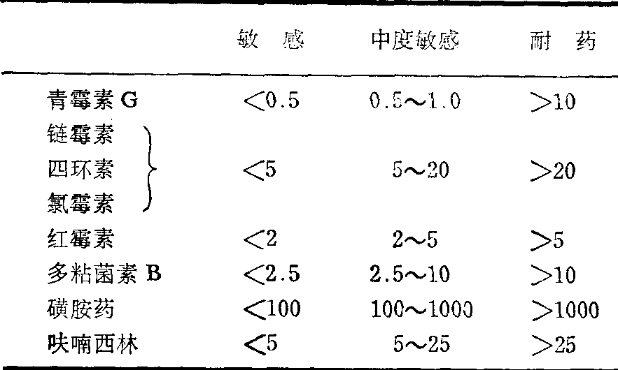(5) 药物敏感试验: 测定标本中致病菌对药物的敏感程度,对于临床治疗中选择用药,及时有效地控制感染具有重要意义。细菌敏感度的测定方法很多,有纸碟法、小杯法、凹孔法和试管法等。常用的是单片纸碟法和试管稀释法。前法是取经6小时孵育的试验菌肉汤培养物(生长缓慢者用18~24小时培养物) 均匀涂布于琼脂平板表面,然后以小镊子夹取沾有不同抗菌药物的圆形小滤纸片贴于平板面,各片间隔一定距离。37℃孵育过夜,取出观察结果 (表2)。试管稀释法是先将测试抗菌药物作一系列倍比稀释,然后各管加入经适当稀释的试验菌液,摇匀后经37℃孵育16~18小时后取出,读取结果,以抗菌药物最高稀释度仍能抑制细菌生长者,该管含药浓度即为试验菌株的敏感度(表3)。