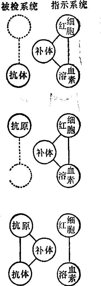 图4 免疫电泳 正常人血清经免疫电泳后,显示白蛋白和几种球蛋白的沉淀弧 补体结合试验(图5) 补体是存在于人和动物血清中的一组球蛋白,本身无特异性,可与任何抗原抗体复合物结合,但不能与游离的抗原或抗体结合。利用此原理,发展成补体结合试验。本试验包括两个系统、五种成分。一为被检系统,即已知抗原(或抗体)和被检的抗体(或抗原); 另一为指示系统,包括绵羊红细胞和特异溶血素。补体采用豚鼠的新鲜血清。方法程序是先将补体加入被检系统,作用一定时间后加入指示系统。继续作用一定时间,观察结果。若不发生溶血,表示被检系统的抗原与抗体是相应的,二者特异地结合后固定了补体,故指示系统不溶血,为补体结合反应阳性。反之,溶血者为补体结合反应阴性。本试验操作较复杂,但敏感性比沉淀反应高。常用于测定病人血清中的抗体,以辅助诊断病毒性疾病或螺旋体病等,亦可用来鉴定自患者分出的未知病毒、立克次体等。