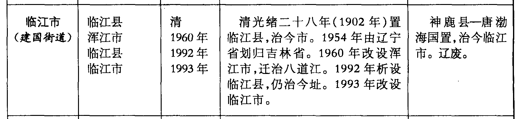 临江市(建国街道)临江县浑江市临江县临江市清1960年1992年1993年清光绪二十八年(1902年)置临江县,治今市。1954年由辽宁省划归吉林省。1960年改设浑江市,迁治八道江。1992年析设临江县,仍治今址。1993年改设临江市。神鹿县—唐渤海国置,治今临江市。辽废。