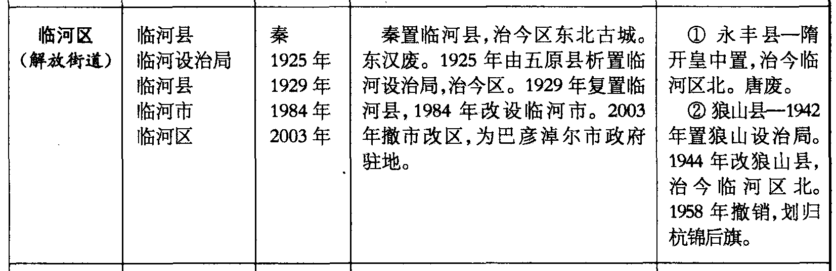 临河区(解放街道)临河县临河设治局临河县临河市临河区秦1925年1929年1984年2003年秦置临河县,治今区东北古城。东汉废。1925年由五原县析置临河设治局,治今区。1929年复置临河县,1984年改设临河市。2003年撤市改区,为巴彦淖尔市政府驻地。❶ 永丰县—隋开皇中置,治今临河区北。唐废。❷狼山县—1942年置狼山设治局。1944年改狼山县,治今临河区北。1958年撤销,划归杭锦后旗。