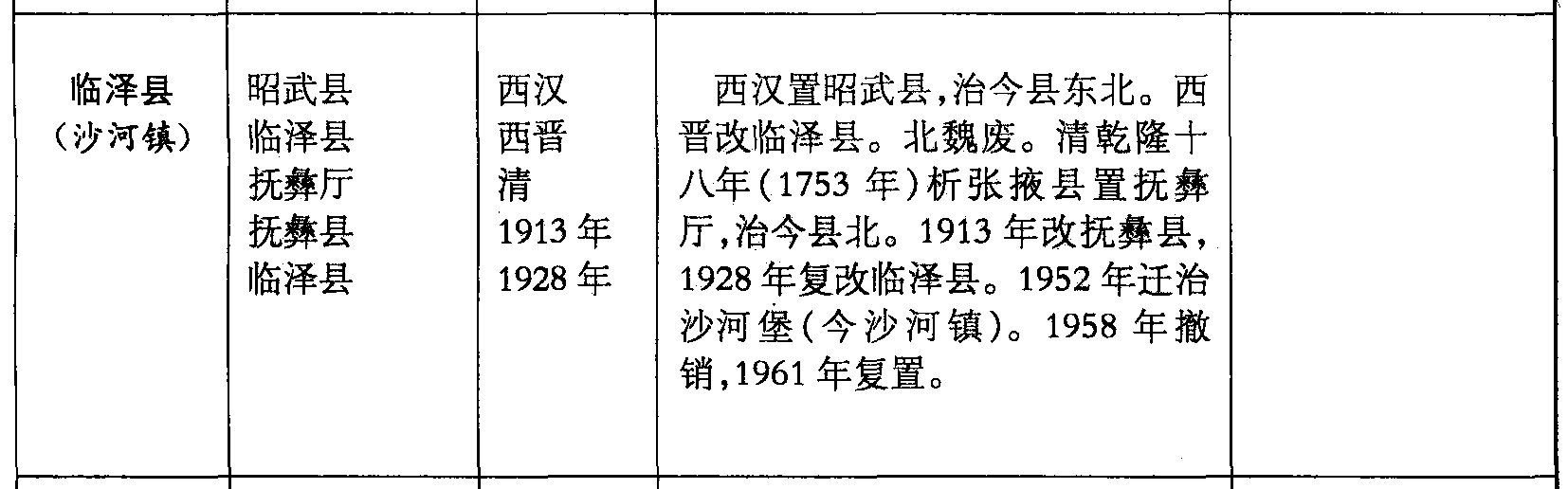 临泽县(沙河镇)昭武县临泽县抚彝厅抚彝县临泽县西汉西晋清1913年1928年西汉置昭武县,治今县东北。西晋改临泽县。北魏废。清乾隆十八年(1753年)析张掖县置抚彝厅,治今县北。1913年改抚彝县,1928年复改临泽县。1952年迁治沙河堡(今沙河镇)。1958年撤销,1961年复置。