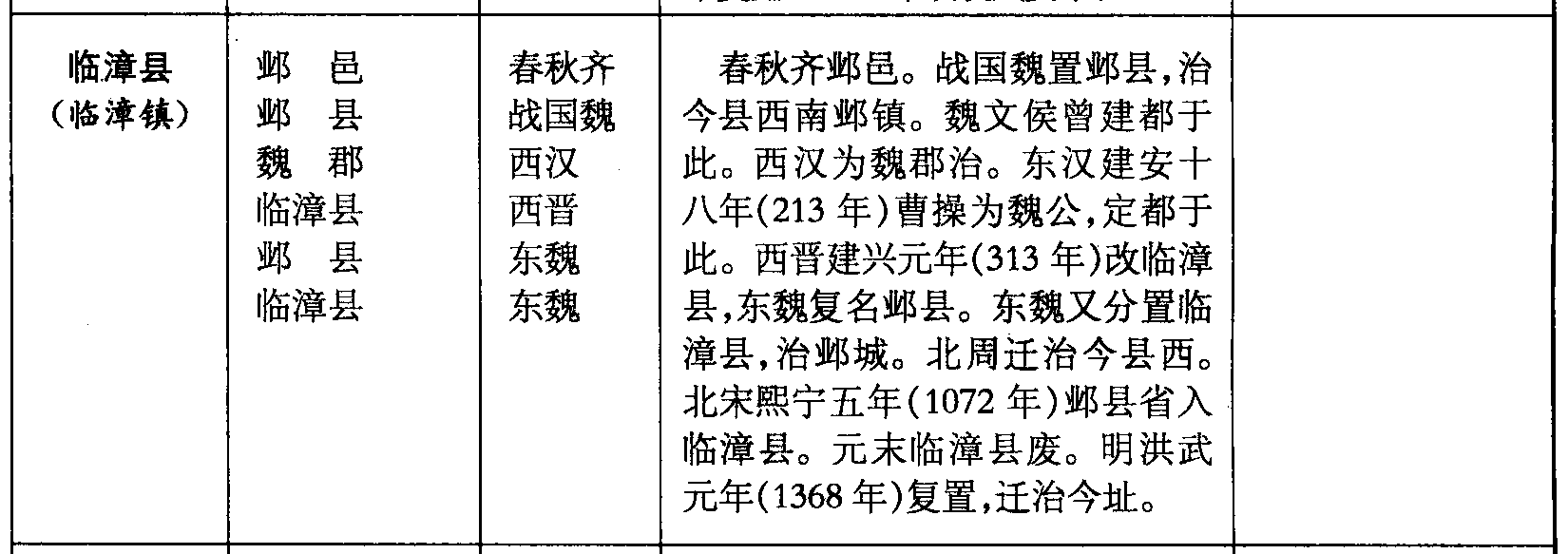 临漳县(临漳镇)邺邑邺县魏郡临漳县邺县临漳县春秋齐战国魏西汉西晋东魏东魏春秋齐邺邑。战国魏置邺县,治今县西南邺镇。魏文侯曾建都于此。西汉为魏郡治。东汉建安十八年(213年)曹操为魏公,定都于此。西晋建兴元年(313年)改临漳县,东魏复名邺县。东魏又分置临漳县,治邺城。北周迁治今县西。北宋熙宁五年(1072年)邺县省入临漳县。元末临漳县废。明洪武元年(1368年)复置,迁治今址。
