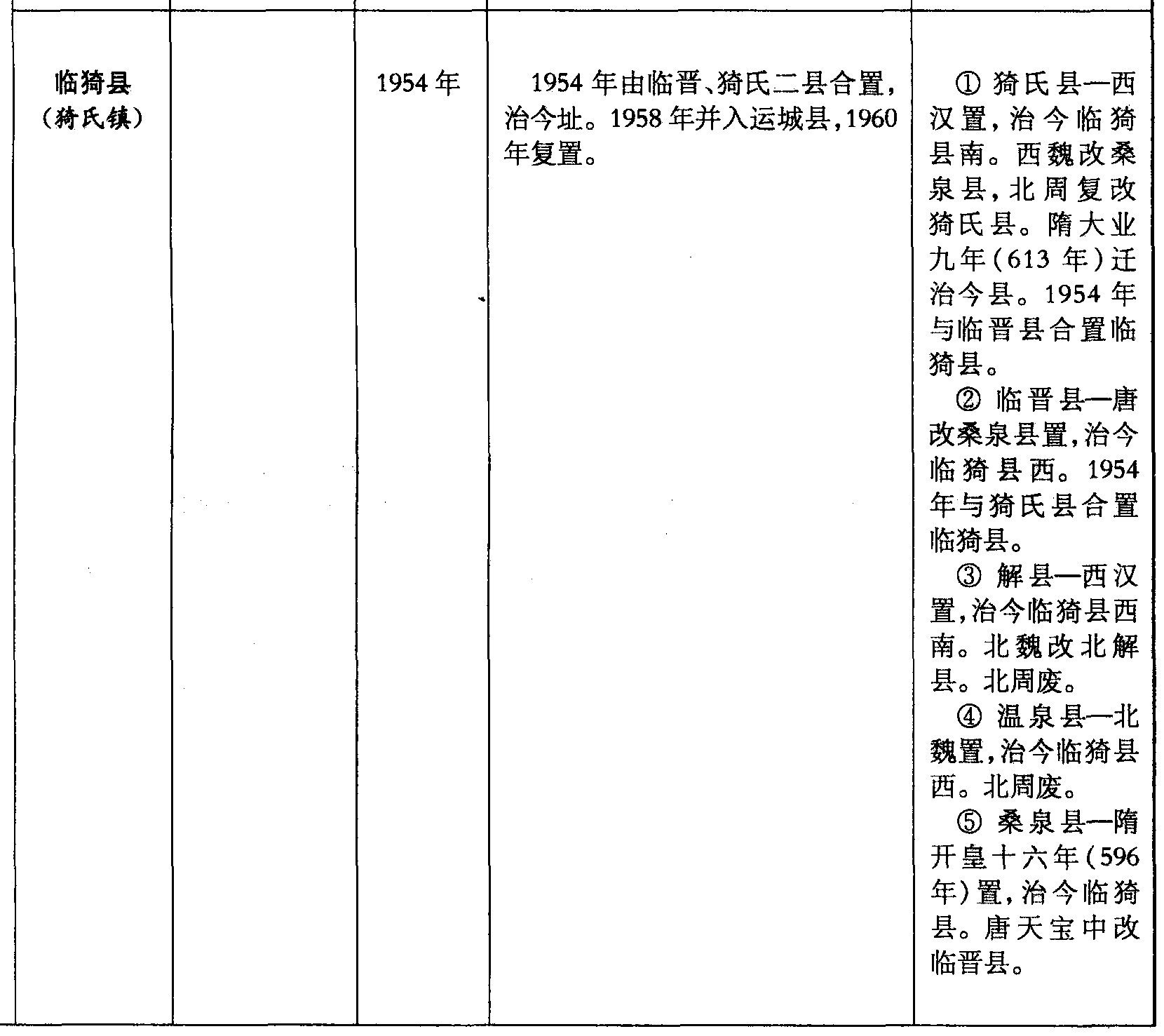 ❶ 猗氏县—西汉置,治今临猗县南。西魏改桑泉县,北周复改猗氏县。隋大业九年(613年)迁治今县。1954年与临晋县合置临猗县。