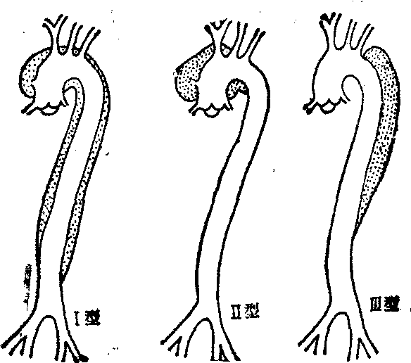图1 主动脉夹层动脉瘤(DeBakey分型) Ⅰ型:主动脉壁剥离部位起始于升主动脉,并向主动脉远段延伸累及降主动脉和腹主动脉。 Ⅱ型: 主动脉壁剥离部位起始,并局限于升主动脉和主动脉弓部。 Ⅲ型:主动脉壁剥离部位起始于左锁骨下动脉开口的远侧,延伸范围局限于降主动脉。 近10年来Austen,Stinson等将主动脉夹层动脉瘤的分