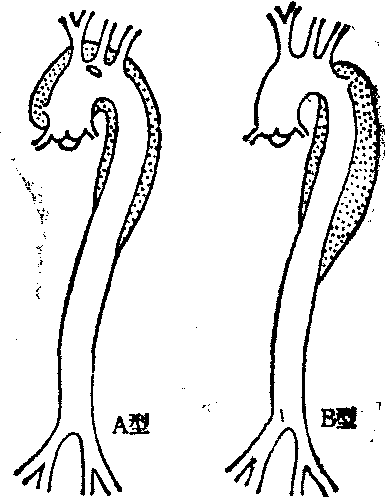 图2 主动脉夹层动脉瘤(Austen、Stinson分型) 类简化为A、B两型(图2)。主动脉壁剥离部位不论起始于升主动脉、主动脉弓部或近段降主动脉,凡剥离范围累及升主动脉者均列为A型,相当于DeBakey分类中的Ⅰ,Ⅱ两型,约2/3的病例属此型。 剥离段仅限于降主动脉者称为B型,相当于DeBakey分类中的Ⅲ型。 临床表现 主动脉夹层动脉瘤起病急骤,突出表现为突然发作的剧烈的撕裂样或刀割样胸痛。剧痛部位常在胸骨后或心前区、上腹部及背部。服用吗啡类药物亦不易缓解。少数病例随着主动脉壁剥离区向远段延伸,胸痛区域从躯体上部向背部、腹部甚或下肢扩展,但放射到肩部、上肢或颈部者则不常见。腹腔内脏动脉分支受累者可呈现上腹部剧痛、恶心、呕吐、便血或呕血。主动脉分支受累则可因中枢神经系统或上肢急性缺血呈现偏瘫、截瘫、单瘫、昏迷、视力障碍、感觉异常等症状。夹层动脉瘤引致主动脉瓣关闭不全者可产生气急、端坐呼吸、肺水肿、咯血等呼吸、循环系统症状。夹层动脉瘤压迫气管可引致呼吸道梗阻; 穿破入心包膜腔或胸膜腔则产生血心包、血胸,病人往往死于出血性休克。 体格检查显示病人表情痛苦、烦躁不安、出汗、肢体湿冷,类似休克,但往往血压仍正常或升高。心率增速,心律多为窦性。夹层动脉瘤累及主动脉分支时,因血流受阻,该区脉搏减弱或消失。由于血管腔内同时有两股血流,有时在同一心搏周期呈现两个脉搏。心前区及主动脉主要分支部位可能听到收缩期杂音。主动脉壁夹层病变累及升主动脉根部时可呈现主动脉瓣关闭不全的体征。脑血管血流受累则出现运动和感觉失常。 实验室检查一般无特殊异常。通常血白细胞略为增多,并有内出血者红细胞计数减低。 胸部X线检查对诊断具有重要意义,约半数病人显示纵隔阴影增宽,并可在短时间内继续增大。典型的表现为夹层动脉瘤累及升主动脉者纵隔阴影向右侧突出,累及降主动脉者向左侧突出。升主动脉与主动脉弓影象扩大或主动脉弓部呈现驼峰状局部隆起。有的病例可显现胸膜腔积液。 主动脉造影可明确主动脉夹层动脉瘤的诊断,显示内膜裂破部位及病变范围。主要表现有造影剂在主动脉腔内受压、变形或受阻不通;造影剂分别在主动脉腔内和夹层内显影以及主动脉瓣关闭功能失常等。 心电图检查常显示因高血压引起的左心室肥厚或高电压。此外,一般无异常改变,无心肌梗塞或冠状动脉供血不足的征象。 主动脉夹层动脉瘤的预后险恶。未经治疗的病人约50%于起病后48小时内死亡; 90%于发病后半年内死亡。因此,早期明确诊断,早期合理治疗非常重要。 治疗 临床上怀疑为主动脉夹层动脉瘤的病例应立即给予药物治疗,以迅速降低血压,减少左心室射血搏动力。这样可以有效地防止主动脉壁剥离区持续扩大。常用的药物有阿福那特、硝普钠、心得安、利血平、胍乙啶、氯噻嗪等,同时给予止痛药物,并监测血压、心电图、尿量、肺循环压力等。待胸痛减轻,血压降低,病情稳定后即进行主动脉造影检查,明确诊断,然后根据病变的部位、范围以及病人年龄,身体各系统功能情况考虑治疗方案。 A型病变由于主动脉壁剥离区累及升主动脉,延伸至主动脉根部后易于产生主动脉瓣关闭不全或穿破入心包膜腔引起心脏压塞致死,应早期施行手术治疗。在体外循环(股动脉插管供血)和冷停搏液保护心肌下,切开升主动脉。如主动脉瓣功能正常,内膜裂破区比较局限,且主动脉壁组织基本上完好,则可沿主动脉全周作连续缝合,使剥离的各层主动脉壁组织互相对拢,必要时可用涤纶织片加固,然后作升主动脉对端吻合术(图3)。 如主动脉中层组织脆弱,难于持线,则可在升主动脉切端近段和远段的剥离区内各衬垫以环状涤纶织片,连续缝合近、远段主动脉切端,使主动脉壁各层组织对合闭拢后再吻合主动脉两个切端(图4)。