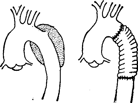 图6 降主动脉夹层动脉瘤。切除降主动脉剥离段,替换以人造血管 升主动脉夹层动脉瘤累及主动脉根部产生主动脉瓣关闭不全且变形脱落者,则需切除主动脉瓣,替换以人造瓣膜,再用一段人造血管替代升主动脉,术中应注意保持从升主动脉进入冠状动脉的血流通畅无阻(图5)。 B型病变经主动脉造影检查证实剥离范围仅限于降主动脉,如给予药物治疗后,胸痛缓解,病情稳定,剥离病变趋于静止,可在严密监测下继续药物治疗。但如药物治疗仍难控制高血压,剥离范围趋向扩大,主动脉主要分支血流受阻,呈现昏迷、卒中、尿量减少、肢体冷痛或主动脉主要分支区域、主动脉瓣区呈现变异不定的杂音时则需施行外科手术治疗。在体外循环、冷停搏液保护心肌下,切除降主动脉剥离段。近、远段切口用涤纶织片加固,缝合、对拢各层主动脉壁组织后,选用口径、长度相当的人造血管与近、远段切端作对端吻合术(图6)。 施行手术治疗后仍需继续药物治疗控制血压并严密监测病人情况。术后一周内需每日作胸部X线检查,观察纵隔阴影宽度,胸膜腔积液和主动脉形态的变化情况。病人出院后仍应密切注意血压情况并定期复查。 早期明确诊断、合理的药物治疗和外科手术已可提高生存率到70~80%。 ☚ 主动脉瘤 主动脉缩窄 ☛ 主动脉夹层动脉瘤 主动脉夹层动脉瘤主动脉夹层动脉瘤是血液渗入主动脉壁并分开其中层而形成的夹层血肿,是一种极为严重的血管疾病。本病较少见,综合国内文献报道确诊的33例中,男性20例,女性13例。最小年龄21岁,最大年龄87岁,22例在40岁以上。