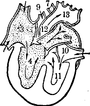 主动脉弓离断时心脏大血管内血流情况示意。离断发生在左锁骨下动脉分出之后。降主动脉的血液由右心室经未闭的动脉导管供应,由于同时有心室间隔缺损,故所供给的血液混有动脉血 (与第8页正常者图比较)。 病儿有严重的心力衰竭,多于出生后一个月内死亡。选择性心血管造影有助于明确诊断。可施行血管移植手术或旁路移植手术治疗。 ☚ 右位主动脉弓 迷走右锁骨下动脉 ☛ |